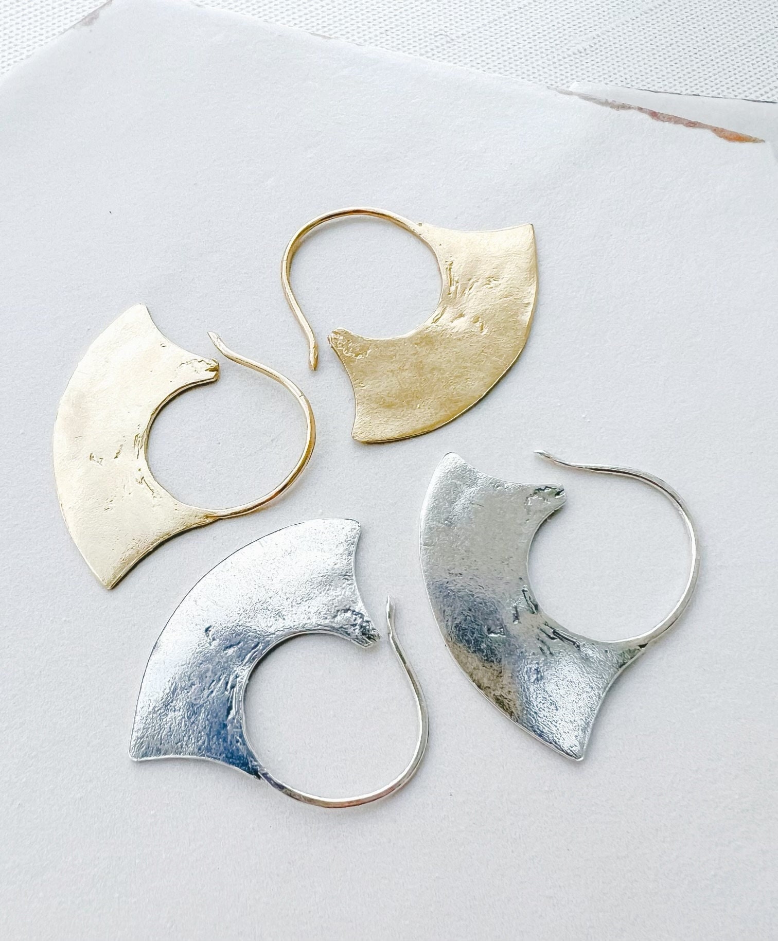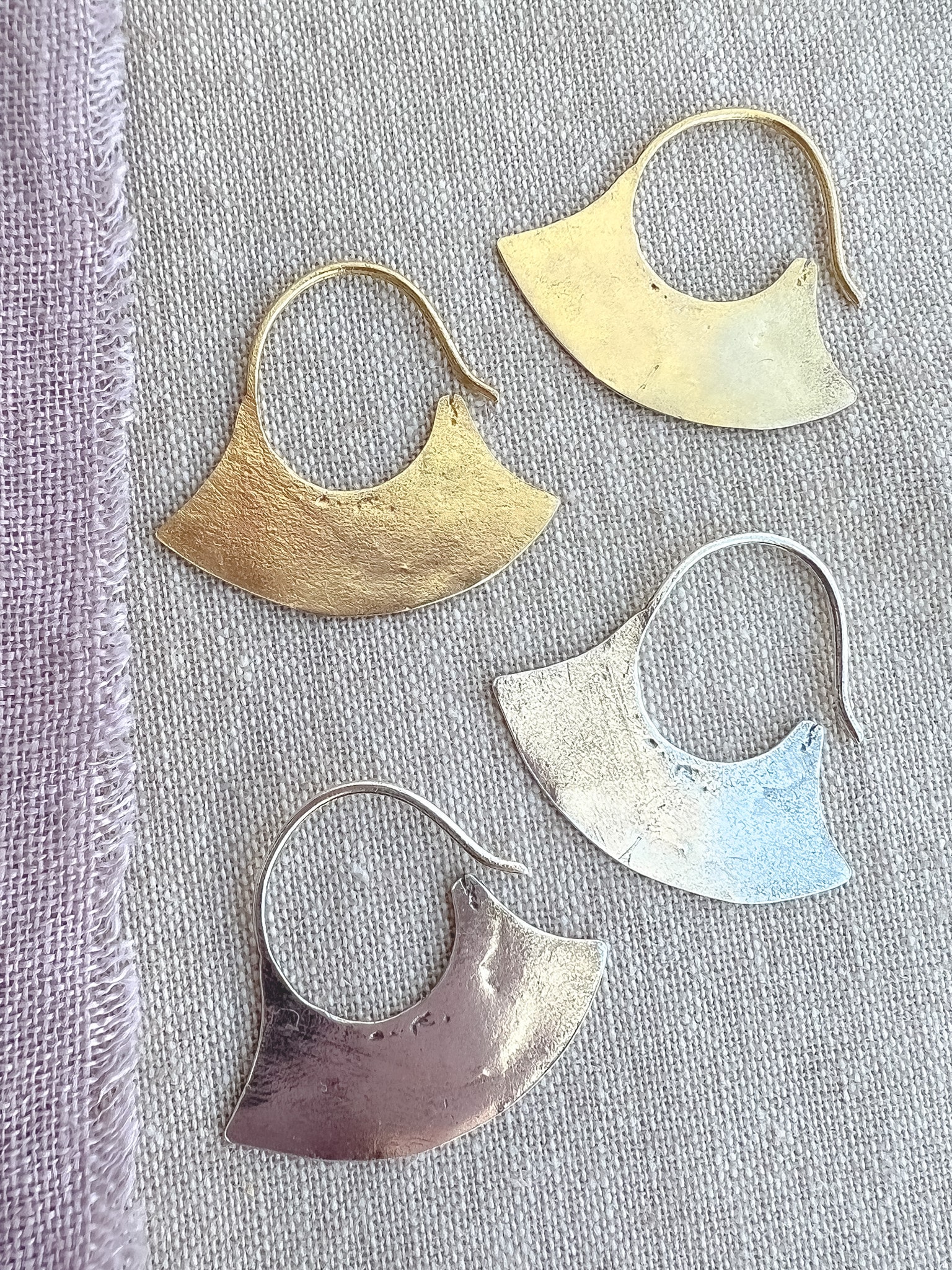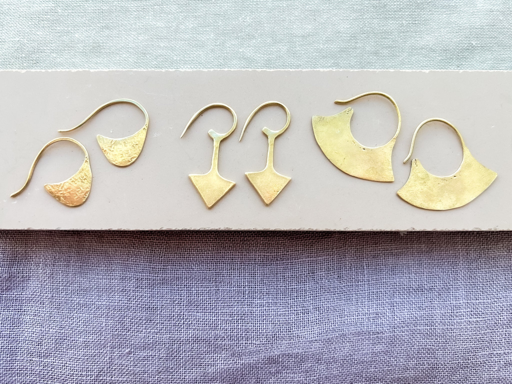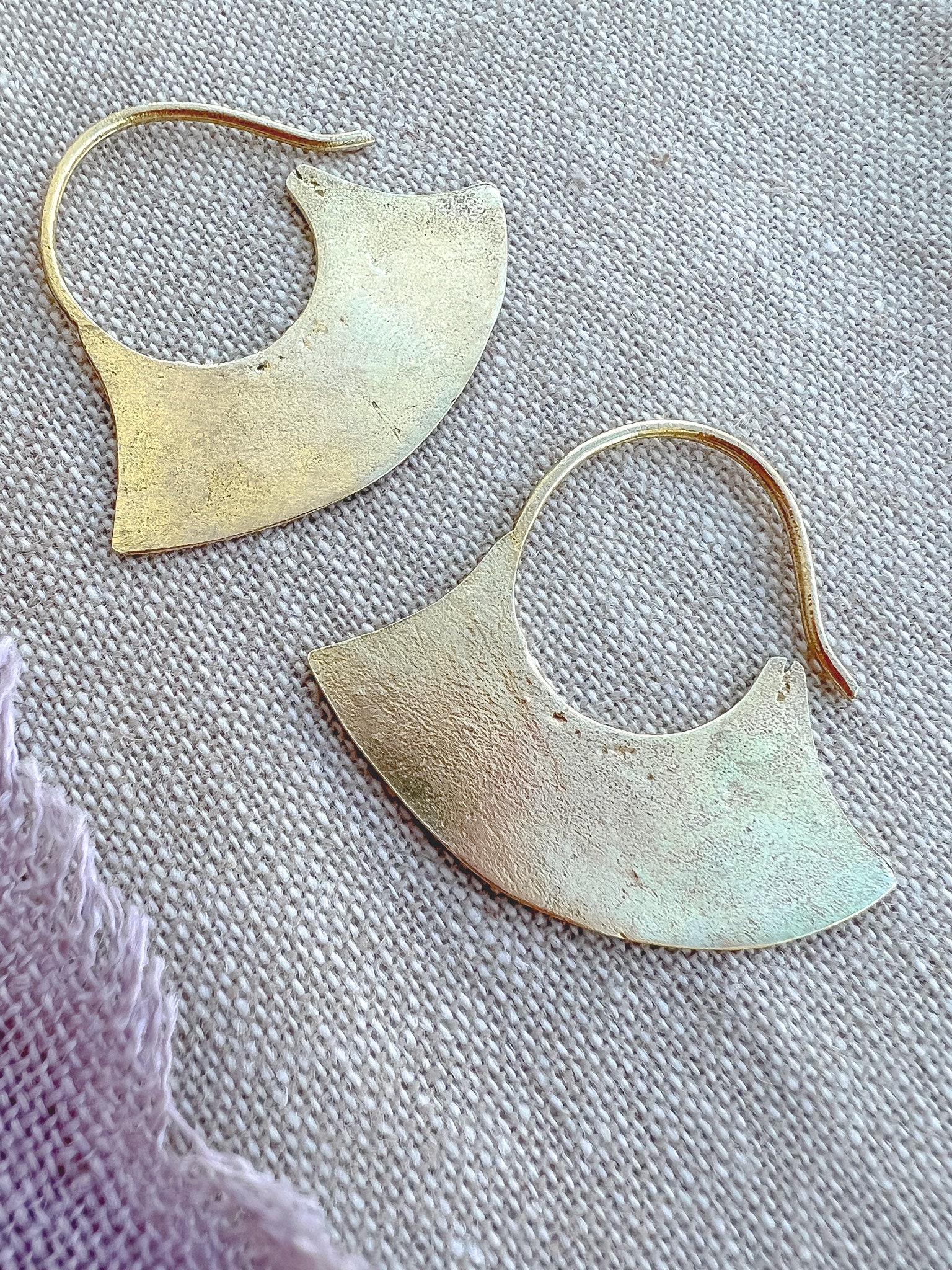 Inspired by ancient Mapuche metalwork - the earliest forms made with silver coins from the Conquistadors. The traditional Upul earrings were made with a single piece of metal and one was often worn by the chief as a symbol of power. Made from recycled brass with a color tone very similar to 14K gold. Tumbled to a lovely glow and wax buffed to enhance its luster and prevent tarnish. Measures just over 1".
