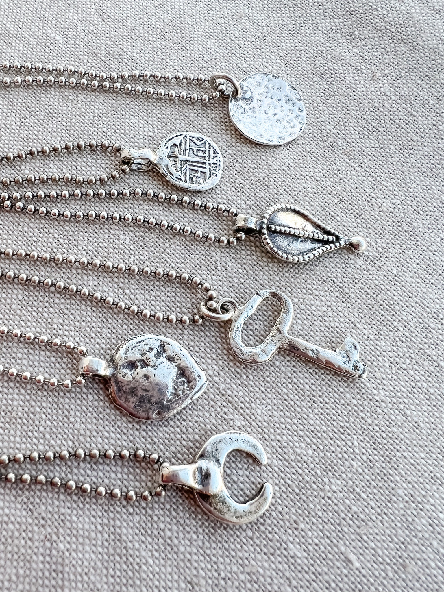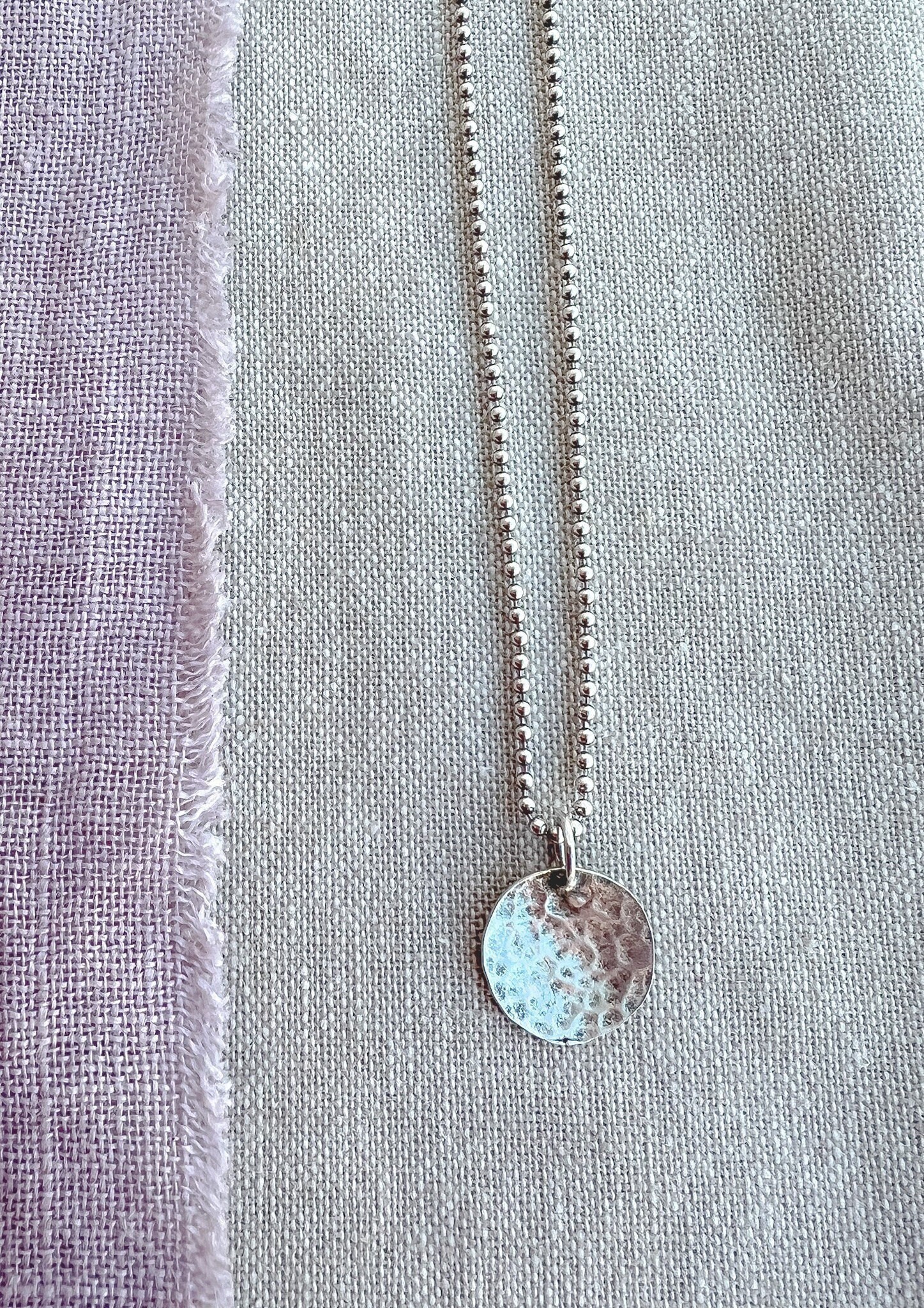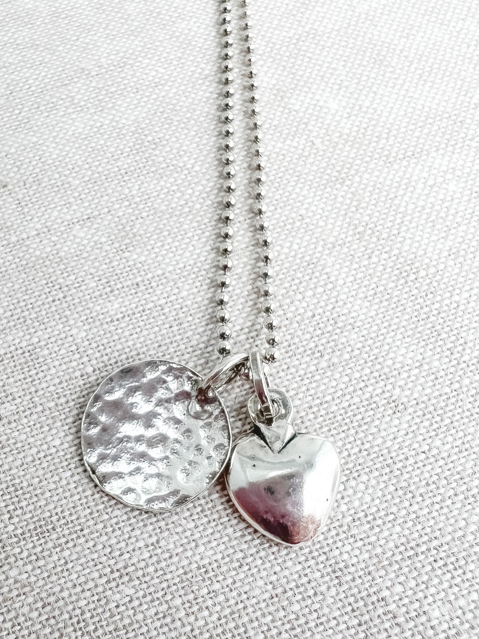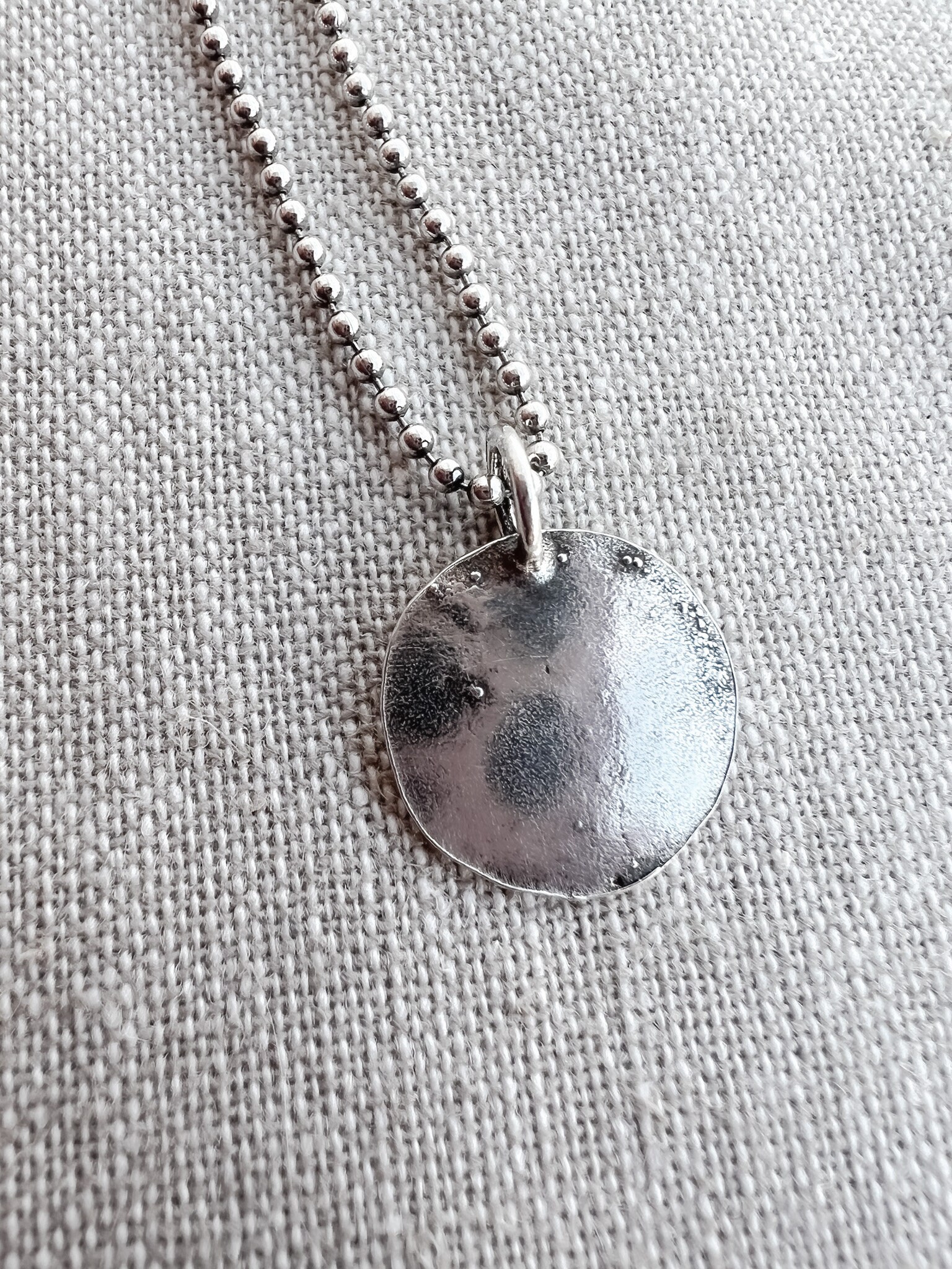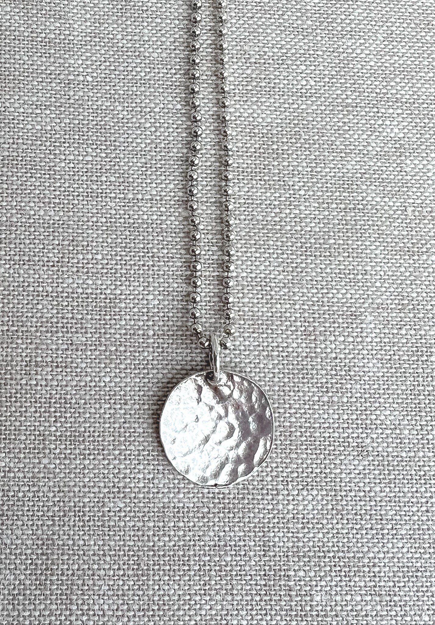 A delicate layering necklace featuring my handmade sterling silver charm on 18" of sterling beaded chain. The front side of the charm has a hammered finish, while the back is a smoother textured finish - it can be worn both ways. The entire piece has been lightly oxidized and tumbled to a hight mirrored polish that highlights the handmade details. Perfect for everyday wear & for mixing with other favorites. Charm is cast in recycled sterling.