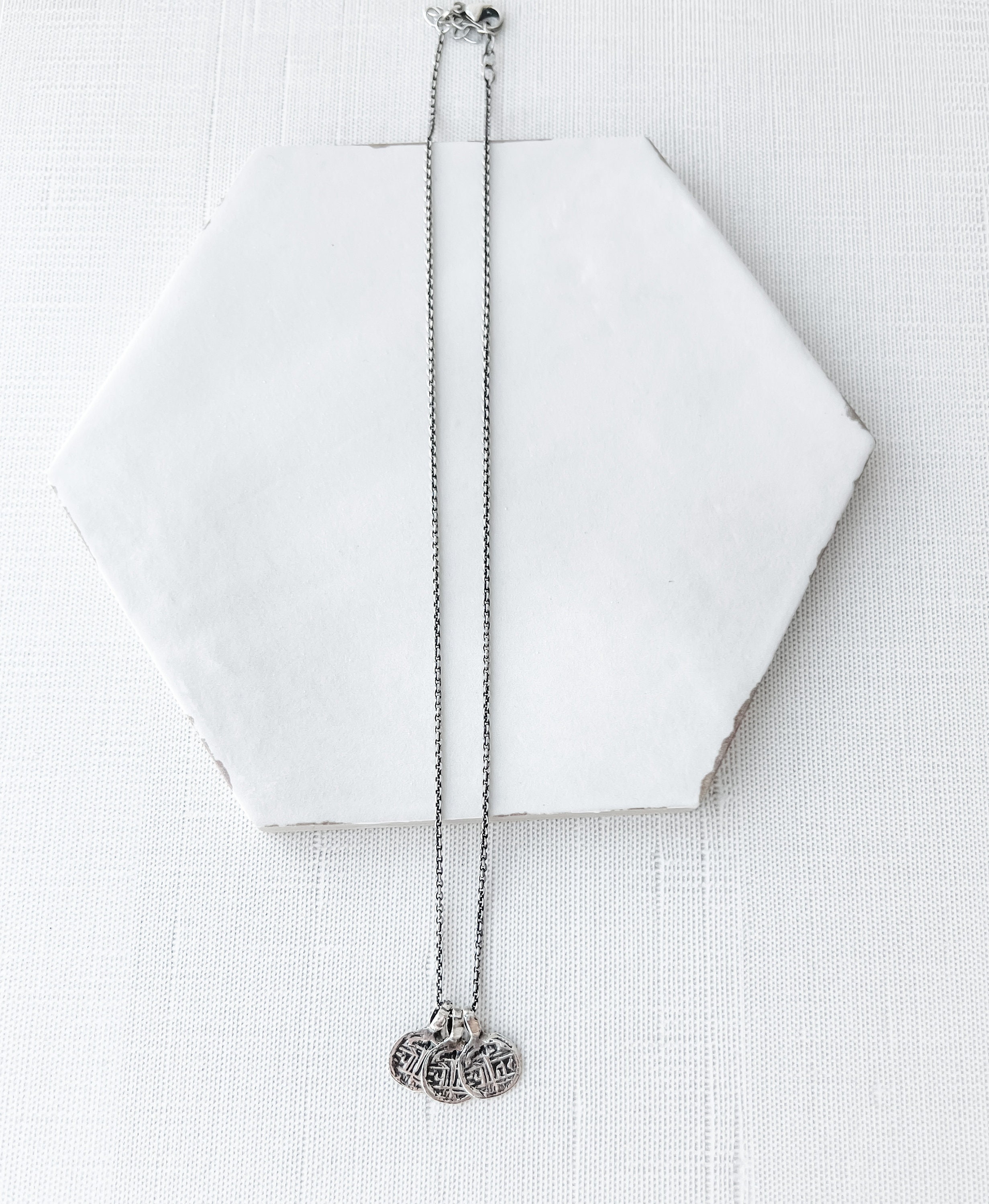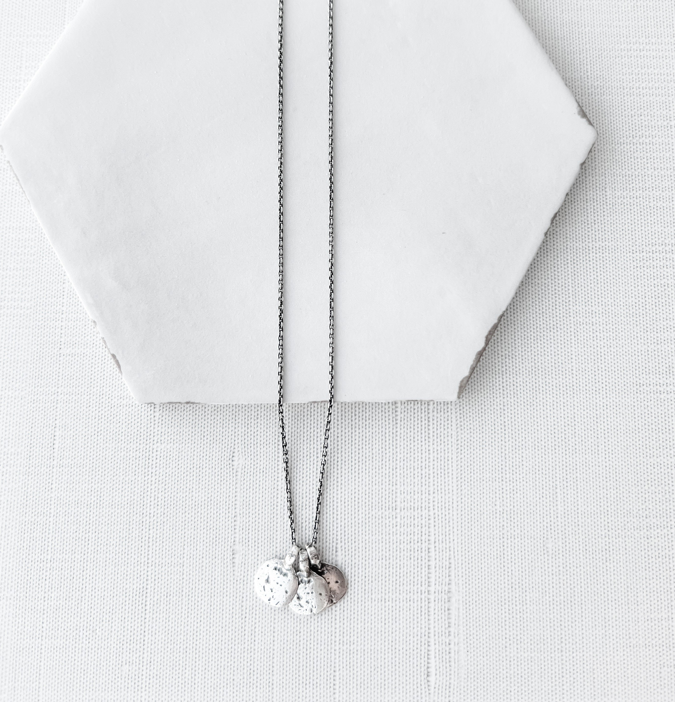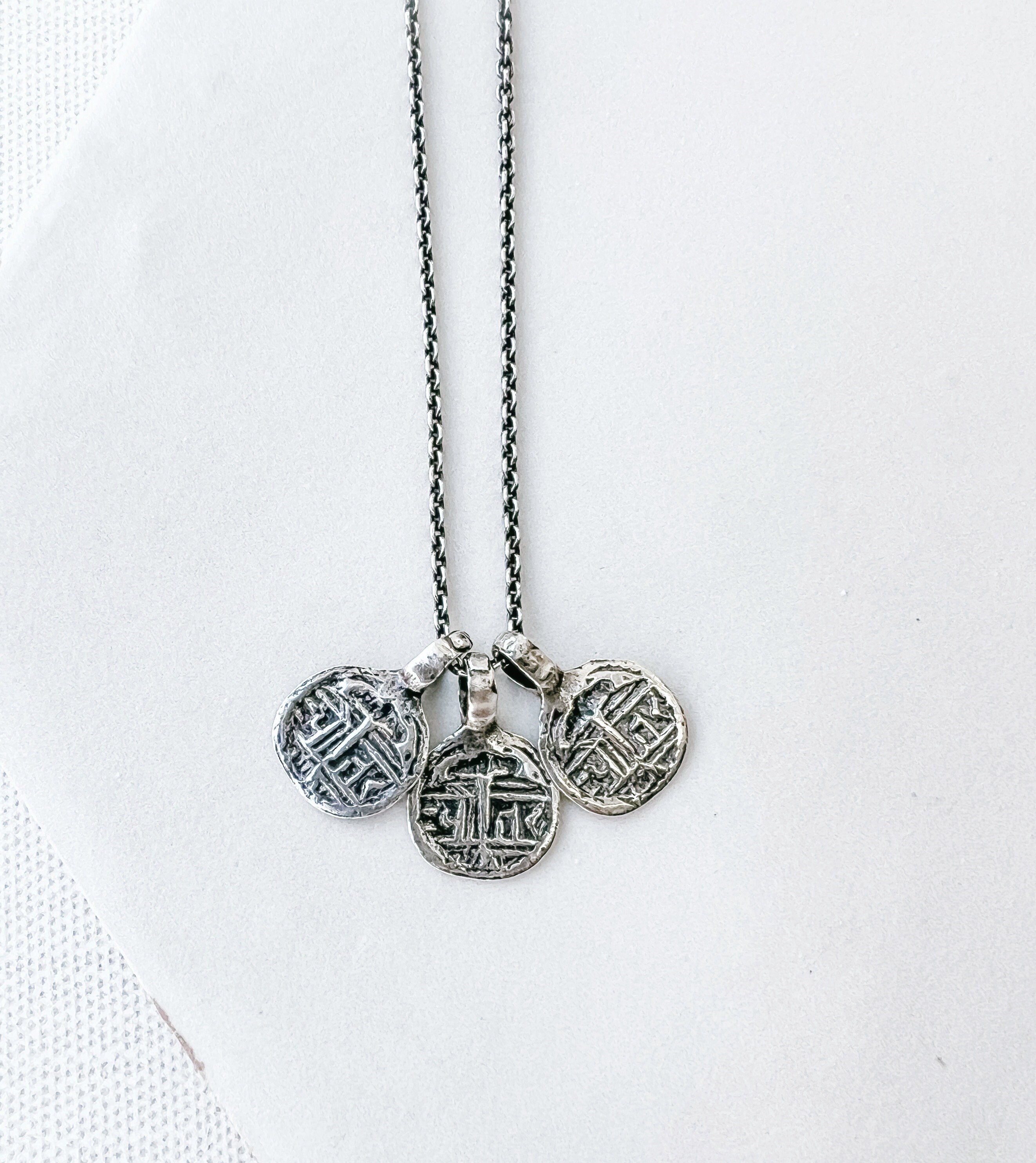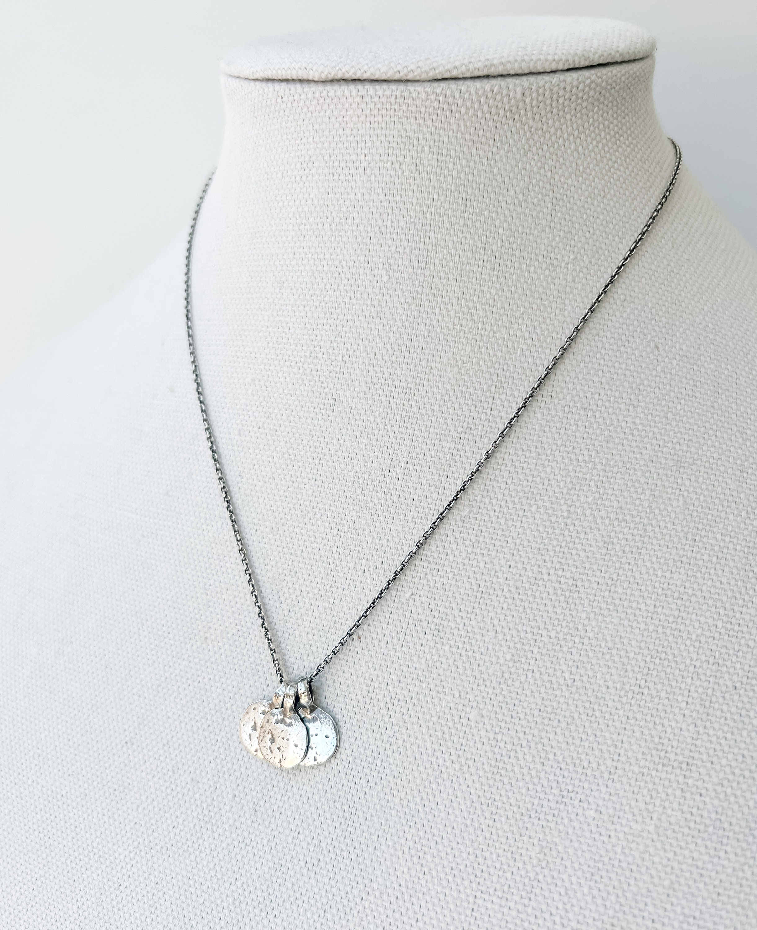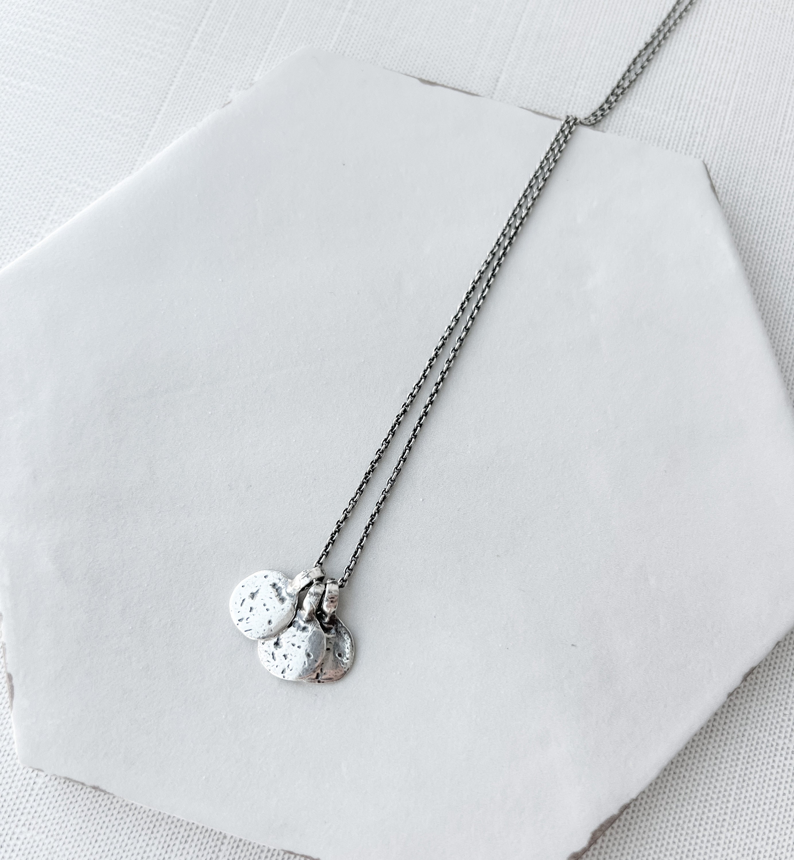 Three time-worn vintage charms that I've cast in sterling silver hang from delicate sterling cable chain. A simple piece that brings interest and texture to your look. Necklace is reversible and can be worn showing the charms' textured or smooth side. Beautiful on its own or layered with other pieces. Oxidized to bring out the details and tumble polished to a beautiful glow.