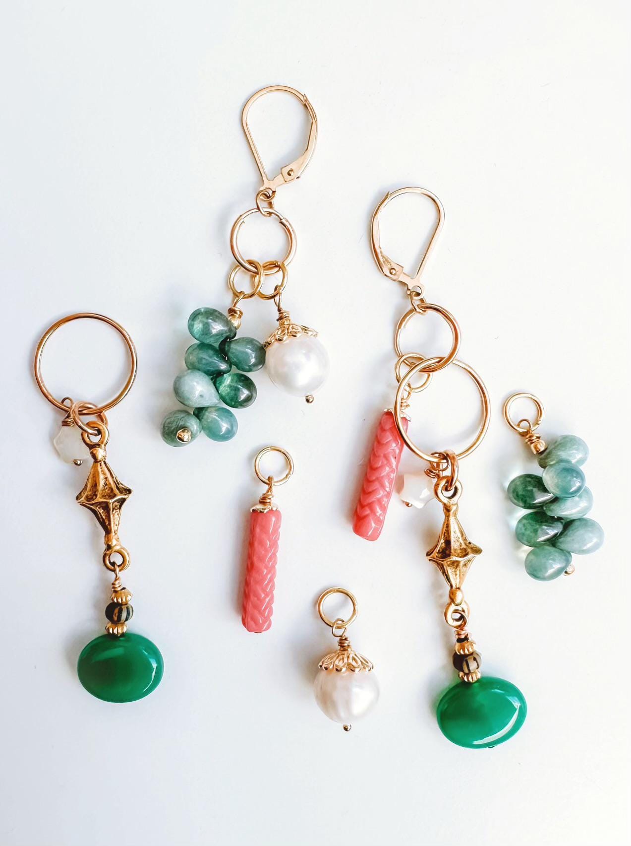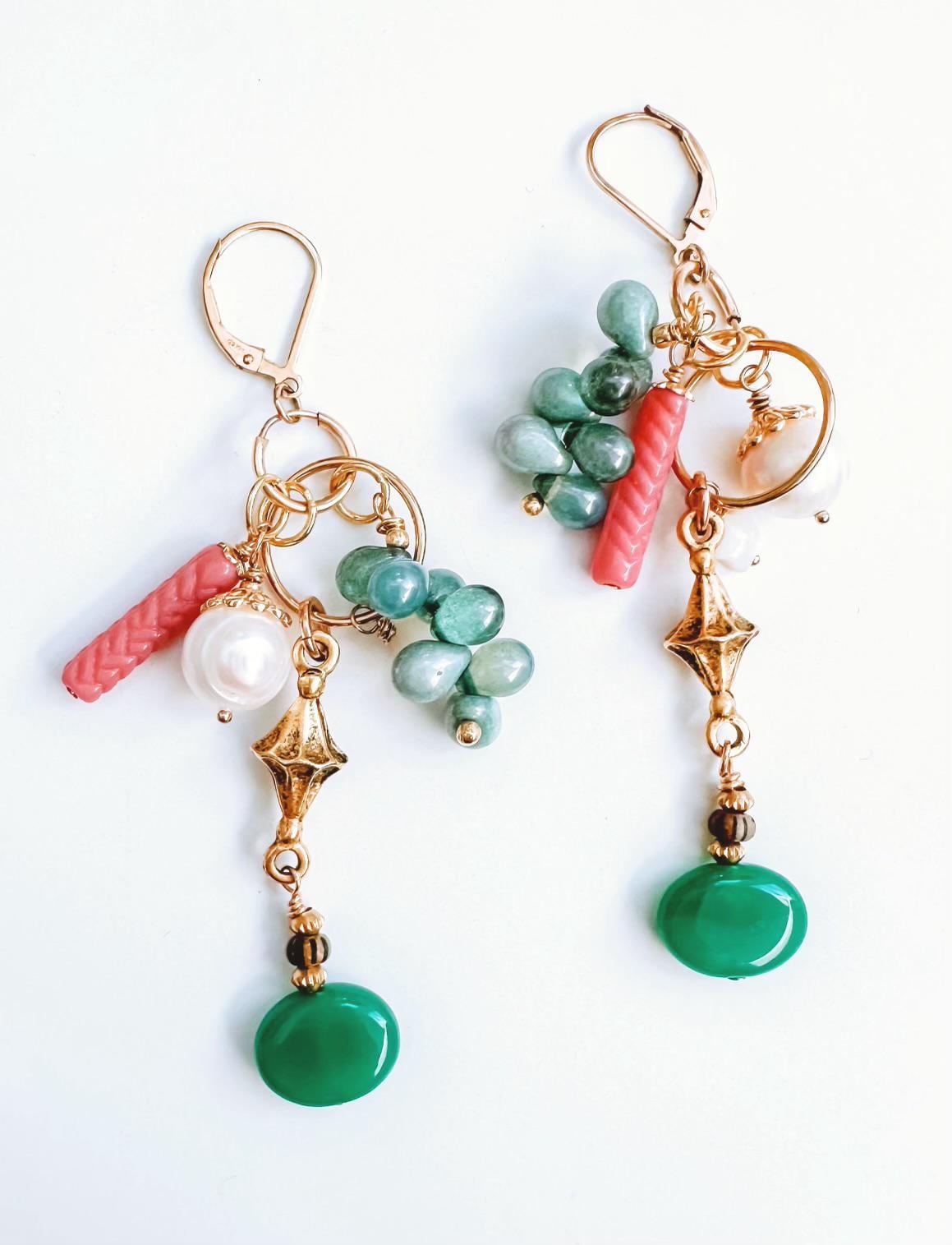 Pretty AND versatile! My Charmed Earrings feature multiple charmes that can be removed and combined in endless variations, making them the hardest working earrings you own. Earring components are 14k gold-filled, chains and charms are a combination of gold-fill, brass, pearl, glass and gemstone. This set features green Aventurine, mother of pearl stars, freshwater pearls and vintage glass. They hang 3.25" at the longest variation.