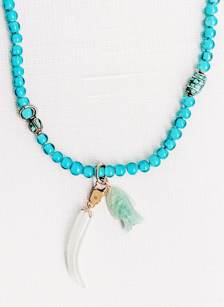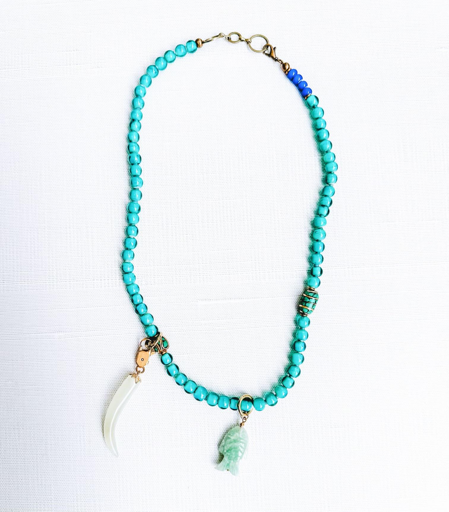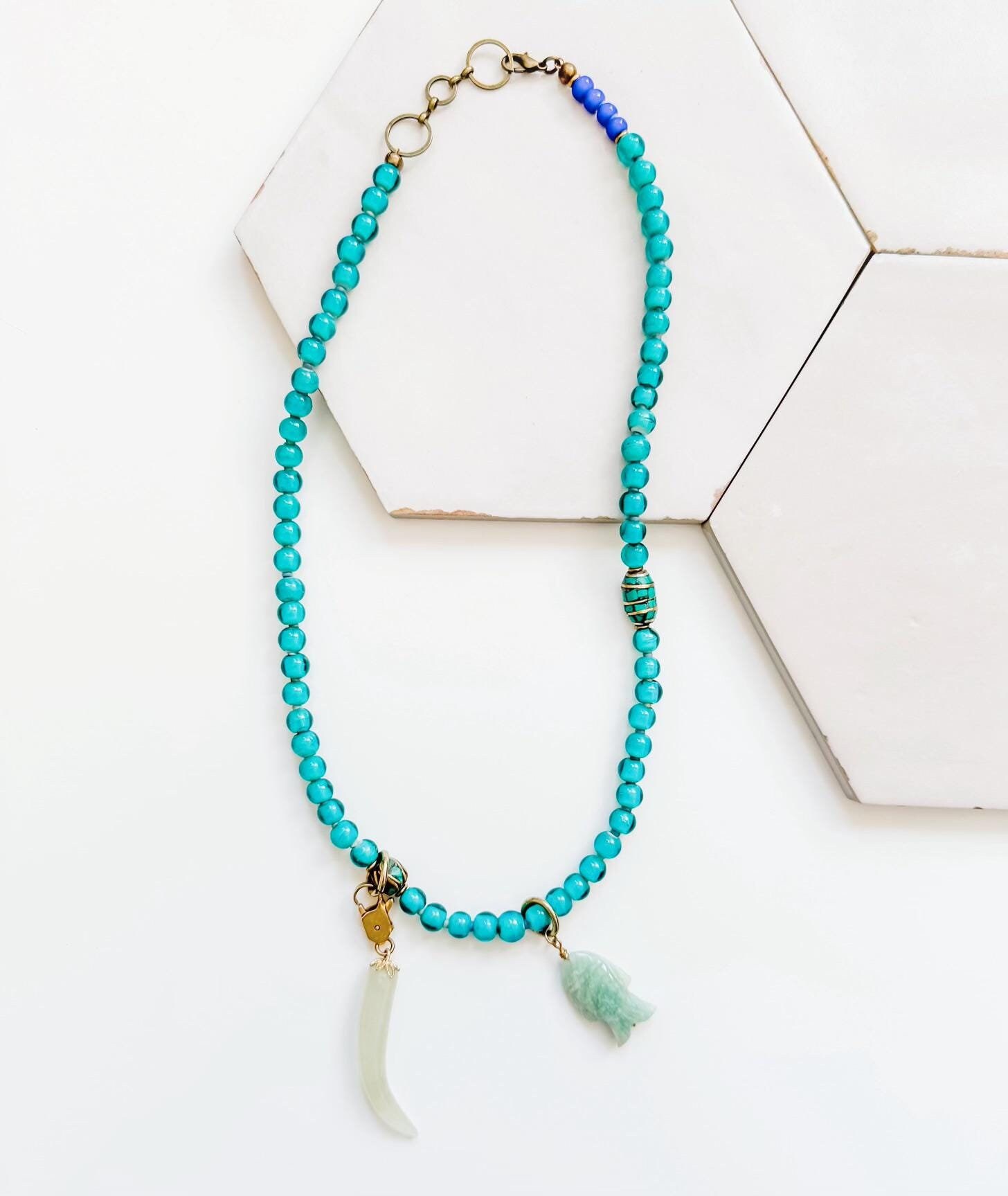 Chunky turquoise and cobalt blue vintage glass, turquoise inlay Nepali beads, and carved jade charms. The tusk charm can be removed or moved around the necklace making it usable with other pieces as well. This piece has a beautiful glow and is one of my personal favorites. 14k gold-filled & brass hardware. Adjustable 19-20.5" in length.