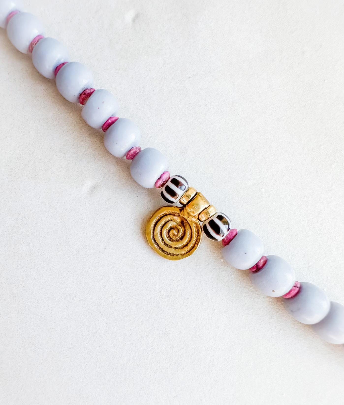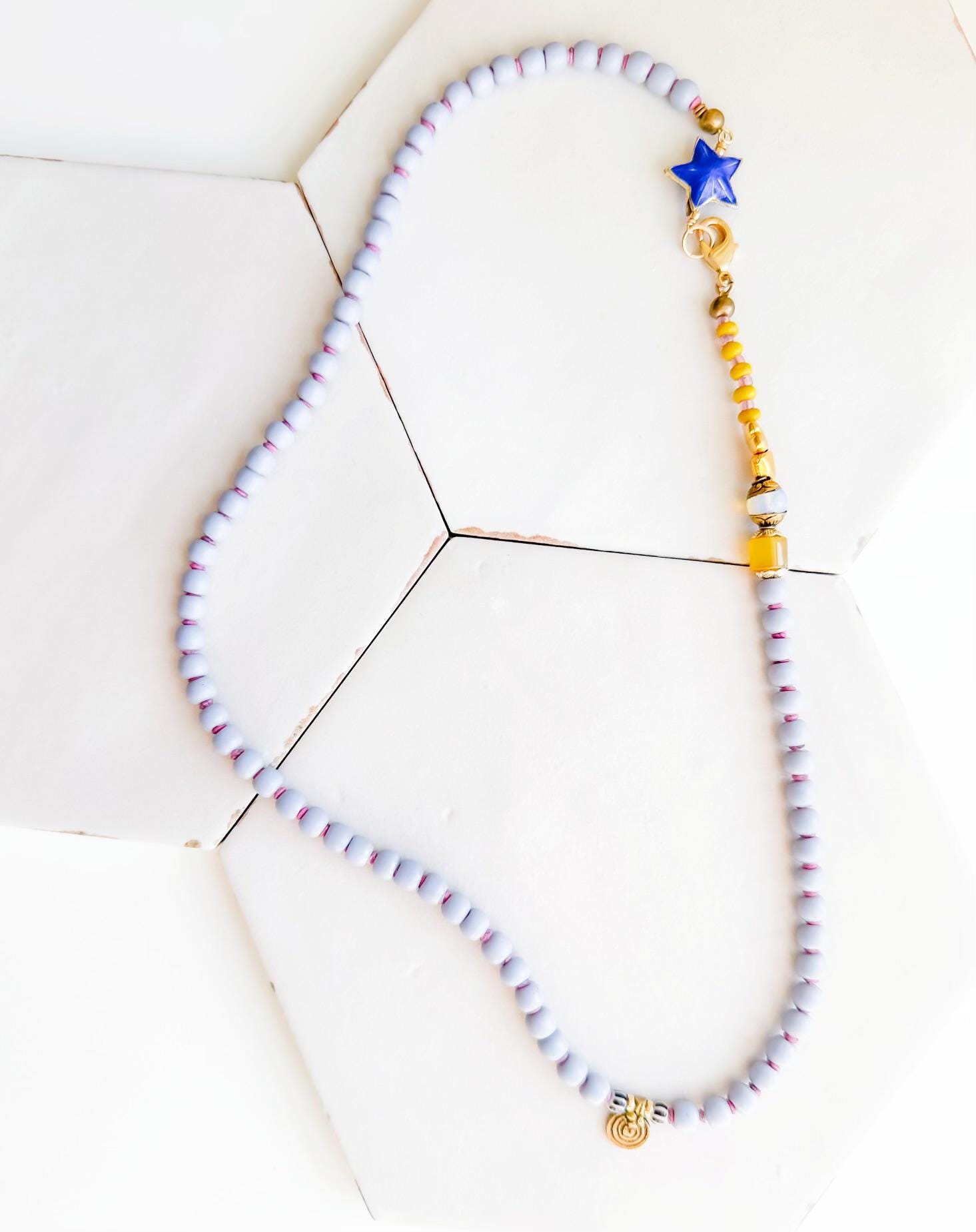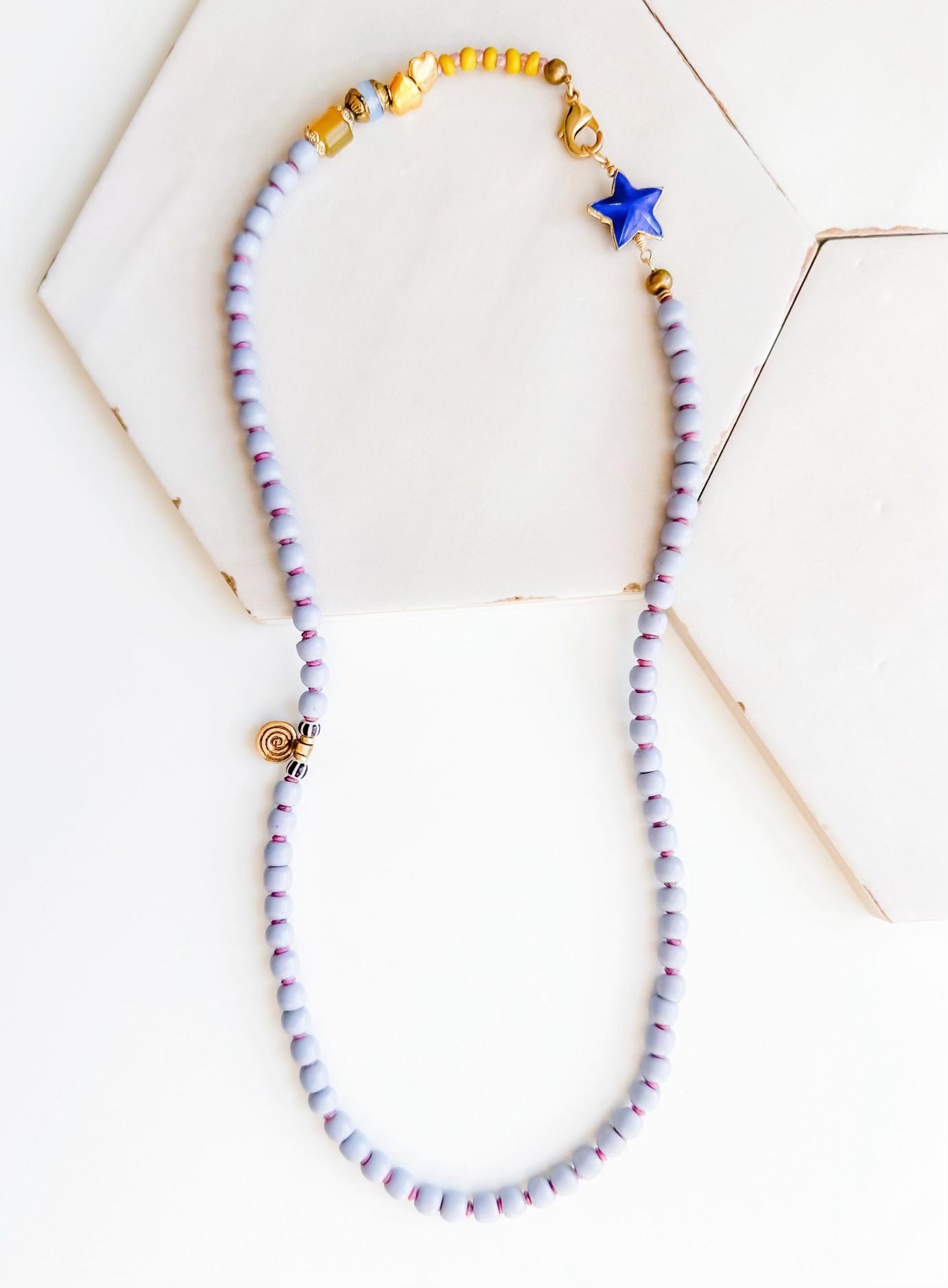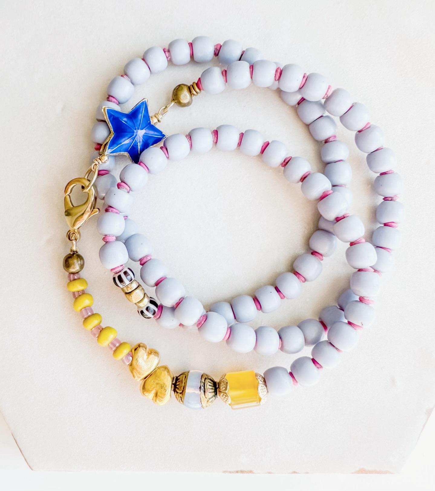 Lavender vintage glass, Chalcedony gemstone & a vintage blue enamel star are just some of the fun components on this necklace-or-wrap-bracelet one-of-a-kind piece. 21" in length. 14k gold-filled hardware.