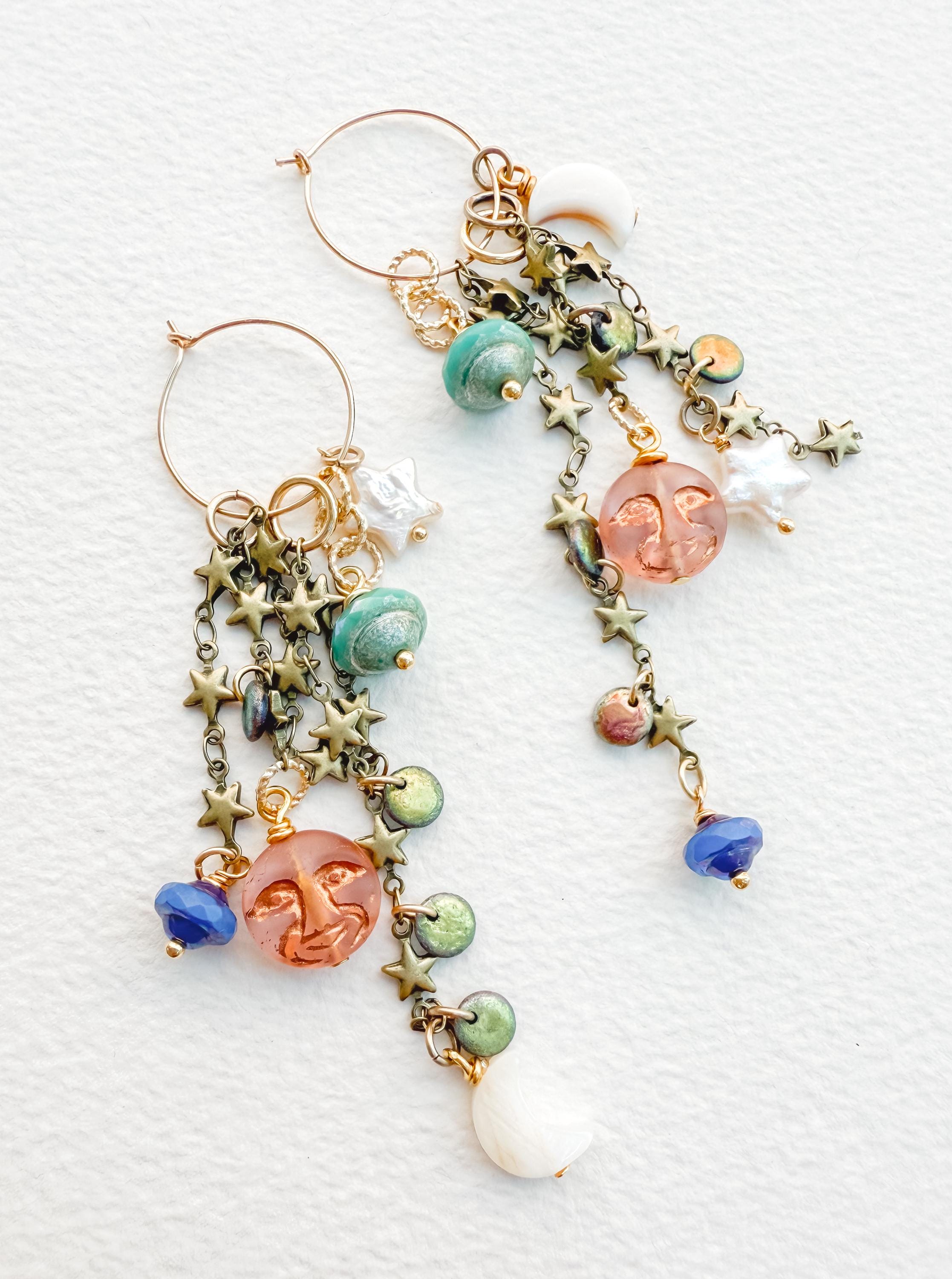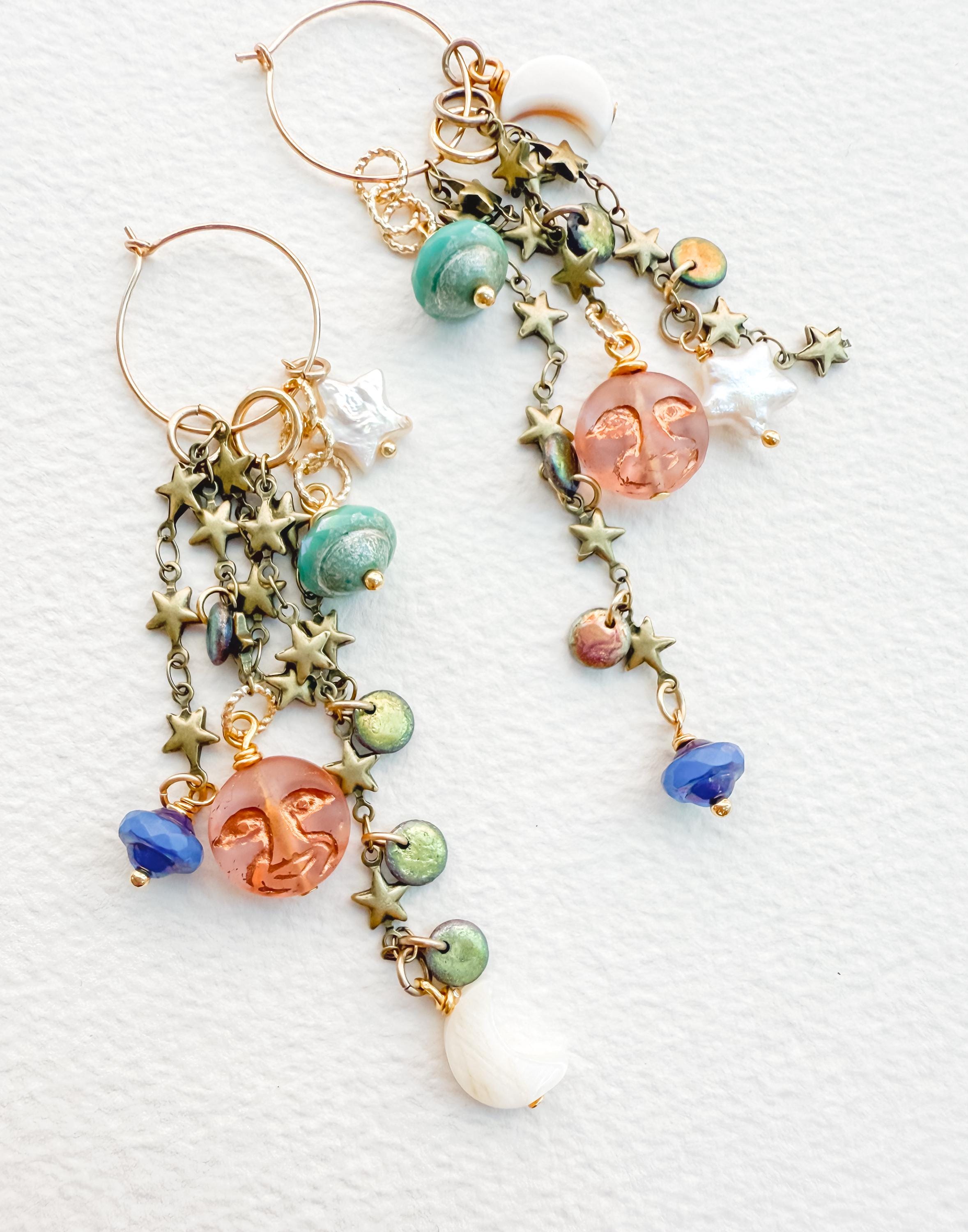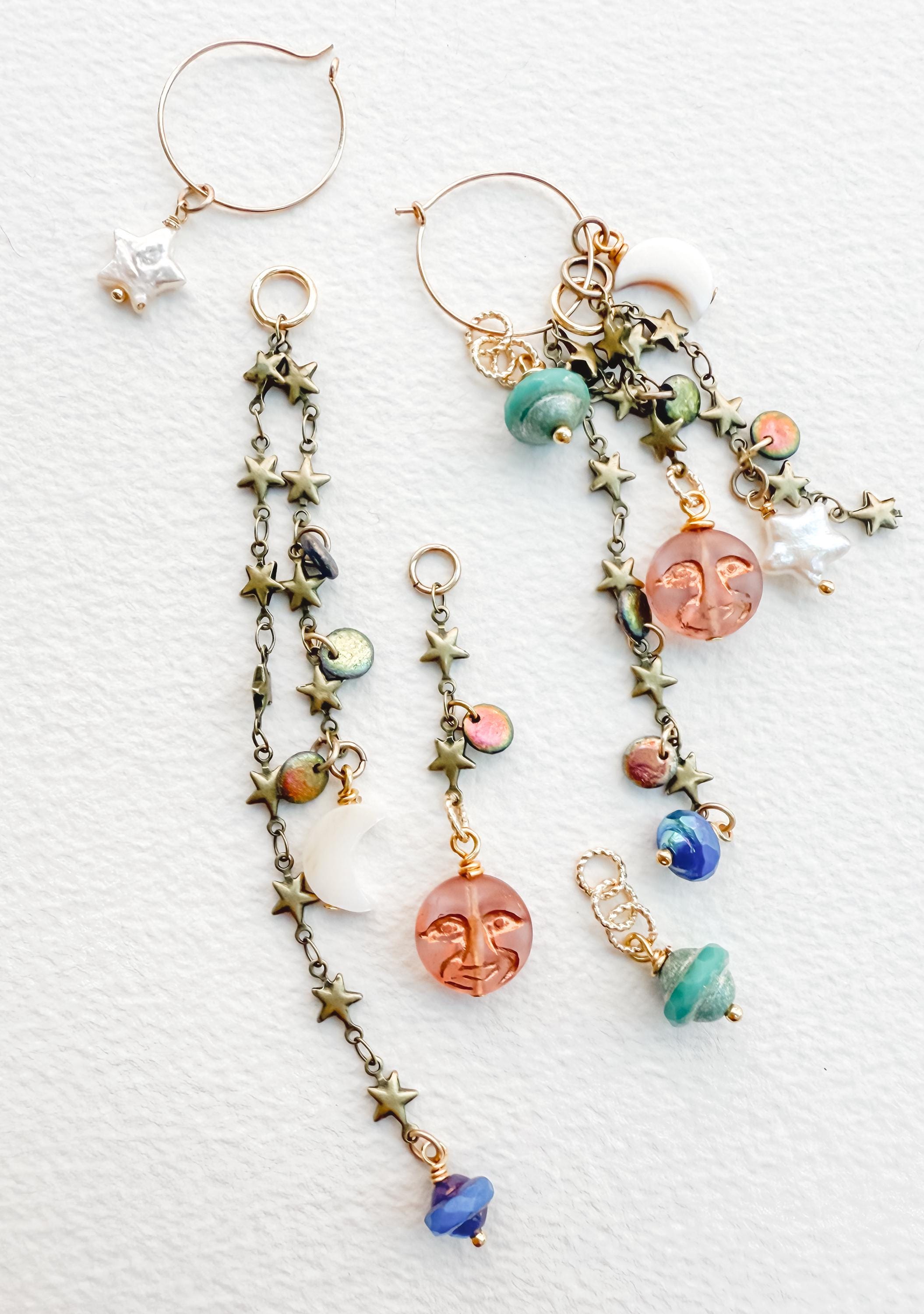 Pretty AND versatile! My Charmed Earrings feature multiple charmes that can be removed and combined in endless variations, making them the hardest working earrings you own. Earring components are 14k gold-filled, chains and charms are a combination of gold-fill, brass, pearl, glass and gemstone. This set features pretty celestial themed charms, glass and mother of pearl along with vintage brass chain. They hang 4" at their longest variation.