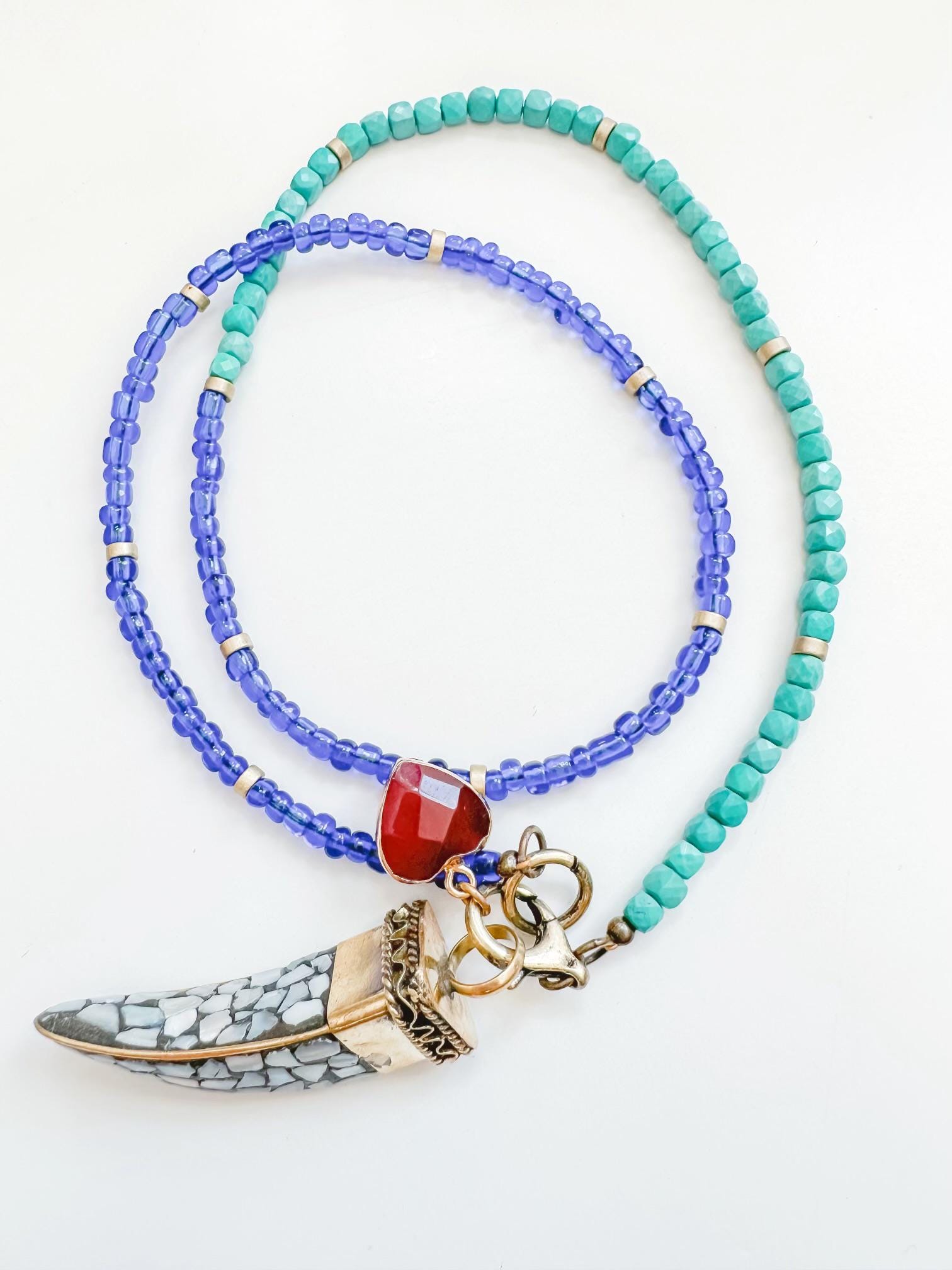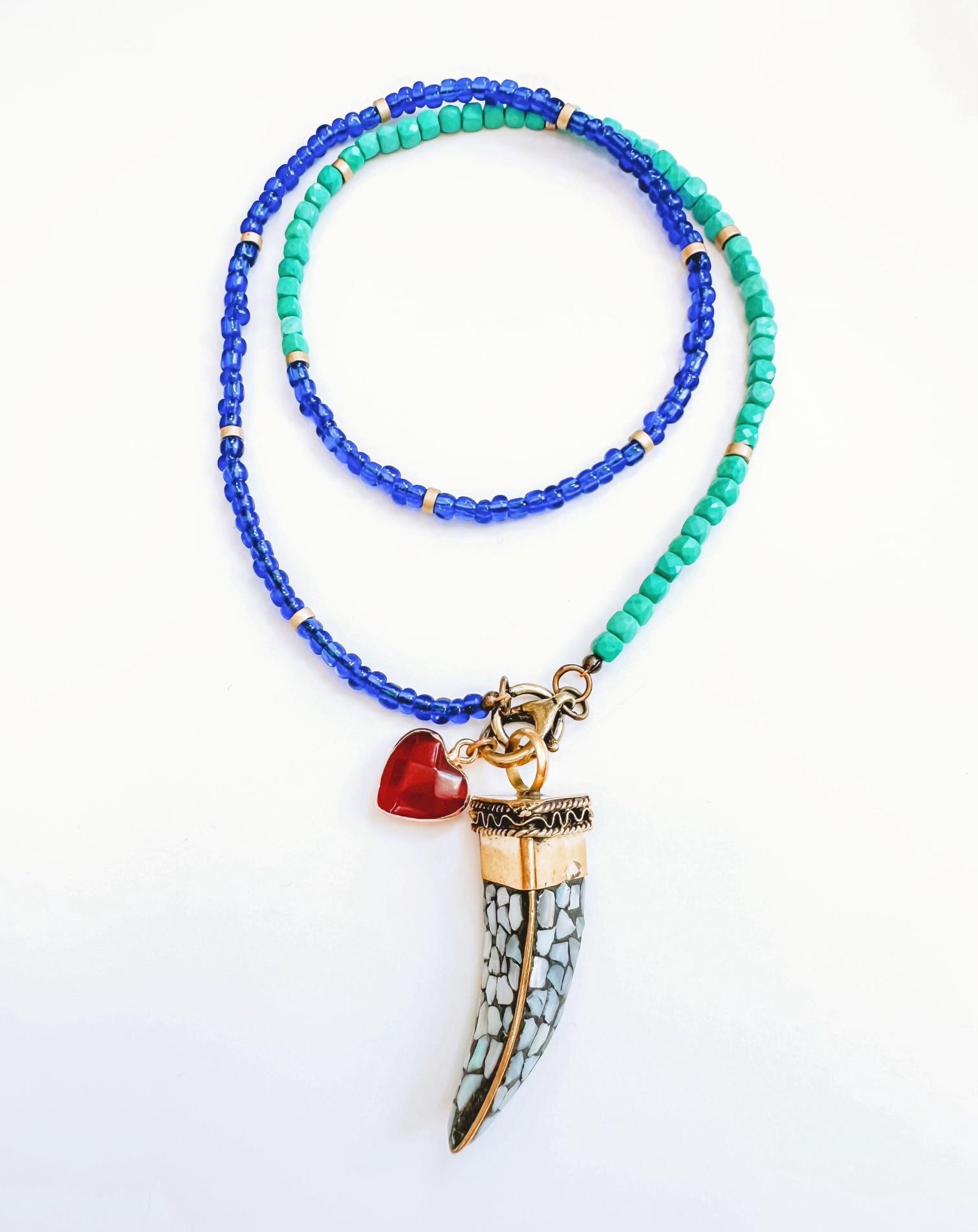 Bright turquoise cubes and deep cobalt vintage trade bead necklace measures 24". Oversized brass lobster clasp. Removable charms are a faceted burgundy agate heart and a brass-capped shell-inlaid tusk pendant.