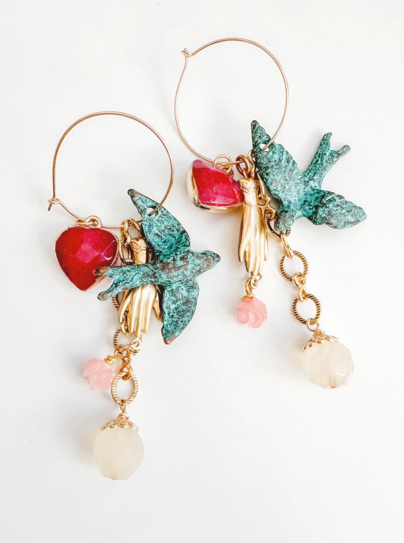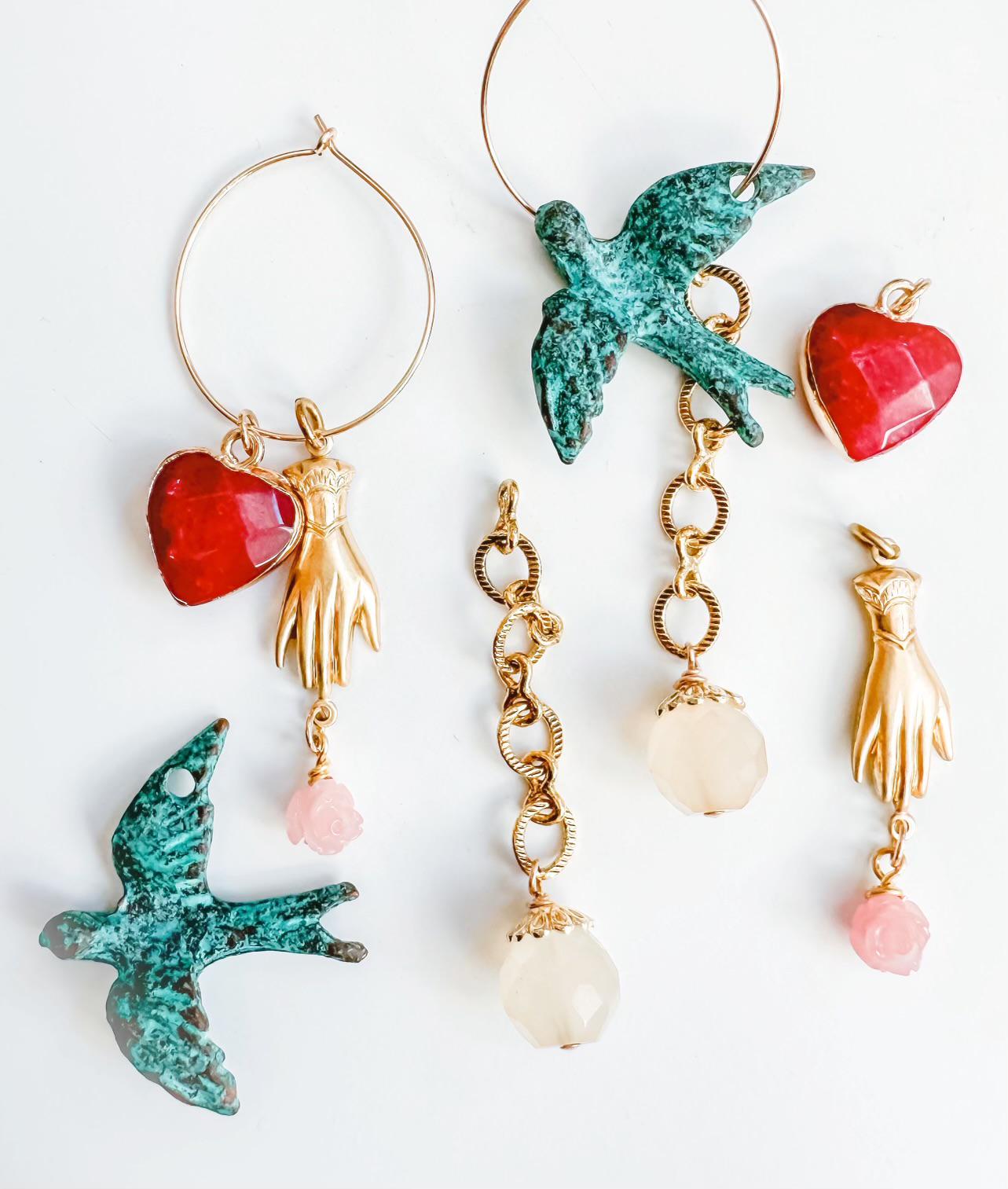 Pretty AND versatile! My Charmed Earrings feature multiple charmes that can be removed and combined in endless variations, making them the hardest working earrings you own. Earring components are 14k gold-filled, chains and charms are a combination of gold-fill, brass, pearl, glass and gemstone. This set features verdigris bird charms from Mykonos, milky Chalcedony, Quart hearts, and a vintage rose charm. They hang 3.25" at the longest variation.
