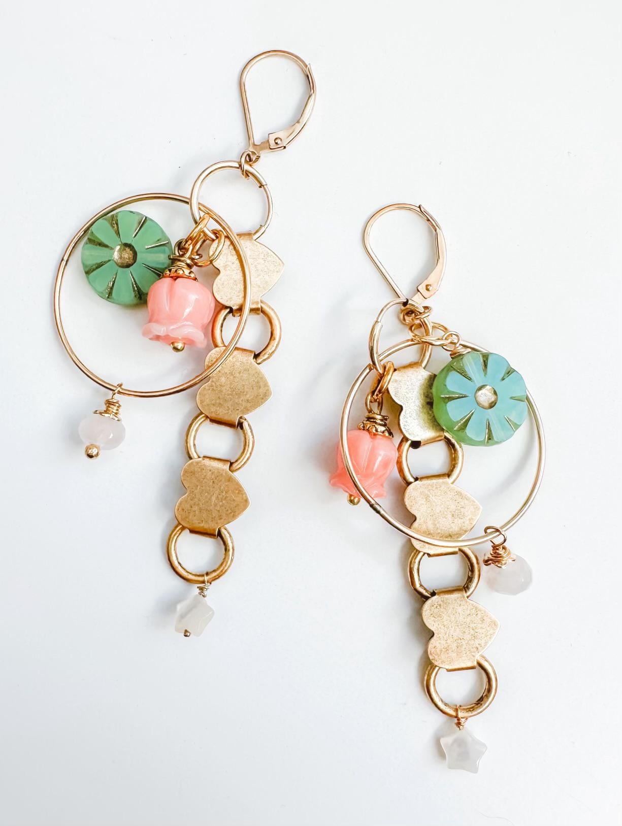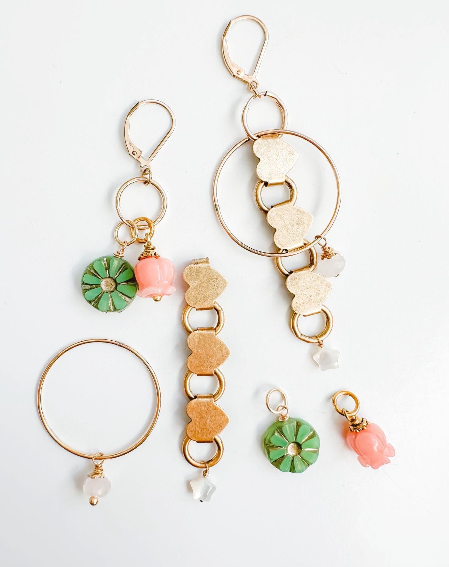 Pretty AND versatile! My Charmed Earrings feature multiple charmes that can be removed and combined in endless variations, making them the hardest working earrings you own. Earring components are 14k gold-filled, chains and charms are a combination of gold-fill, brass, pearl, glass and gemstone. This set features Chalcedony, mother of pearl stars, vintage glass and chain. They hang 3" at the longest variation.