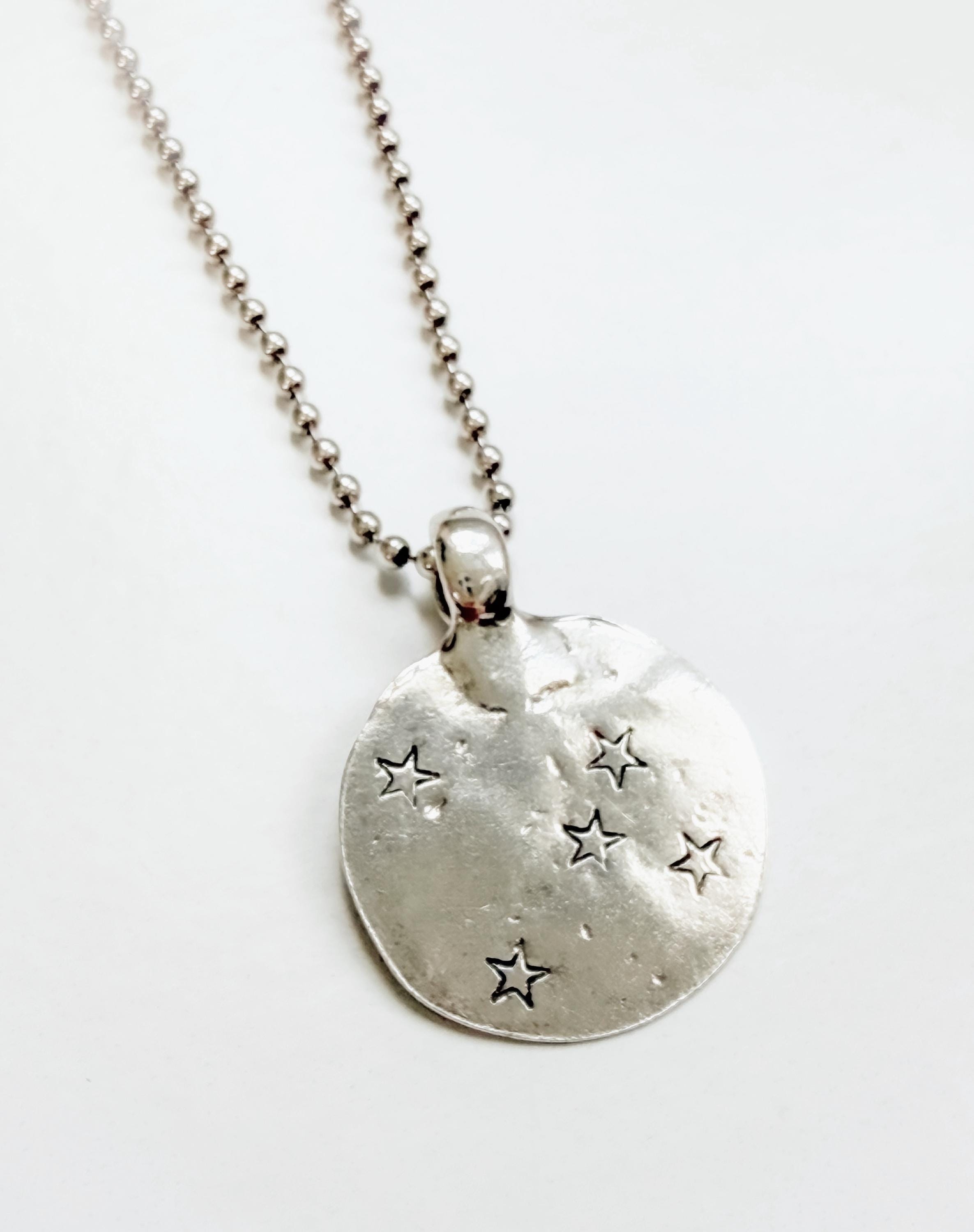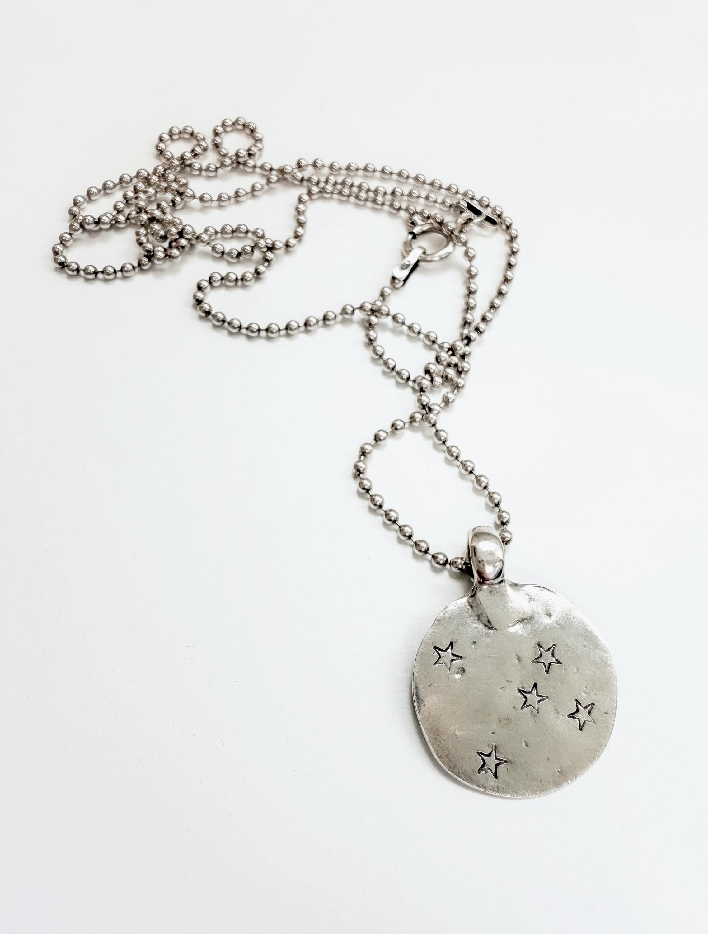 This beautiful pendant is cast from an antique charm from India. The rustic, weathered finish adds a unique touch that can't be duplicated. I hand stamp each star which means your necklace will be one of a kind (though very similar to the one pictured). The charm is roughly 5/8" of an inch and hangs on 18" of sterling beaded chain, It is lightly oxidized to bring out the details then tumbled to a lovely shine.