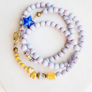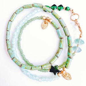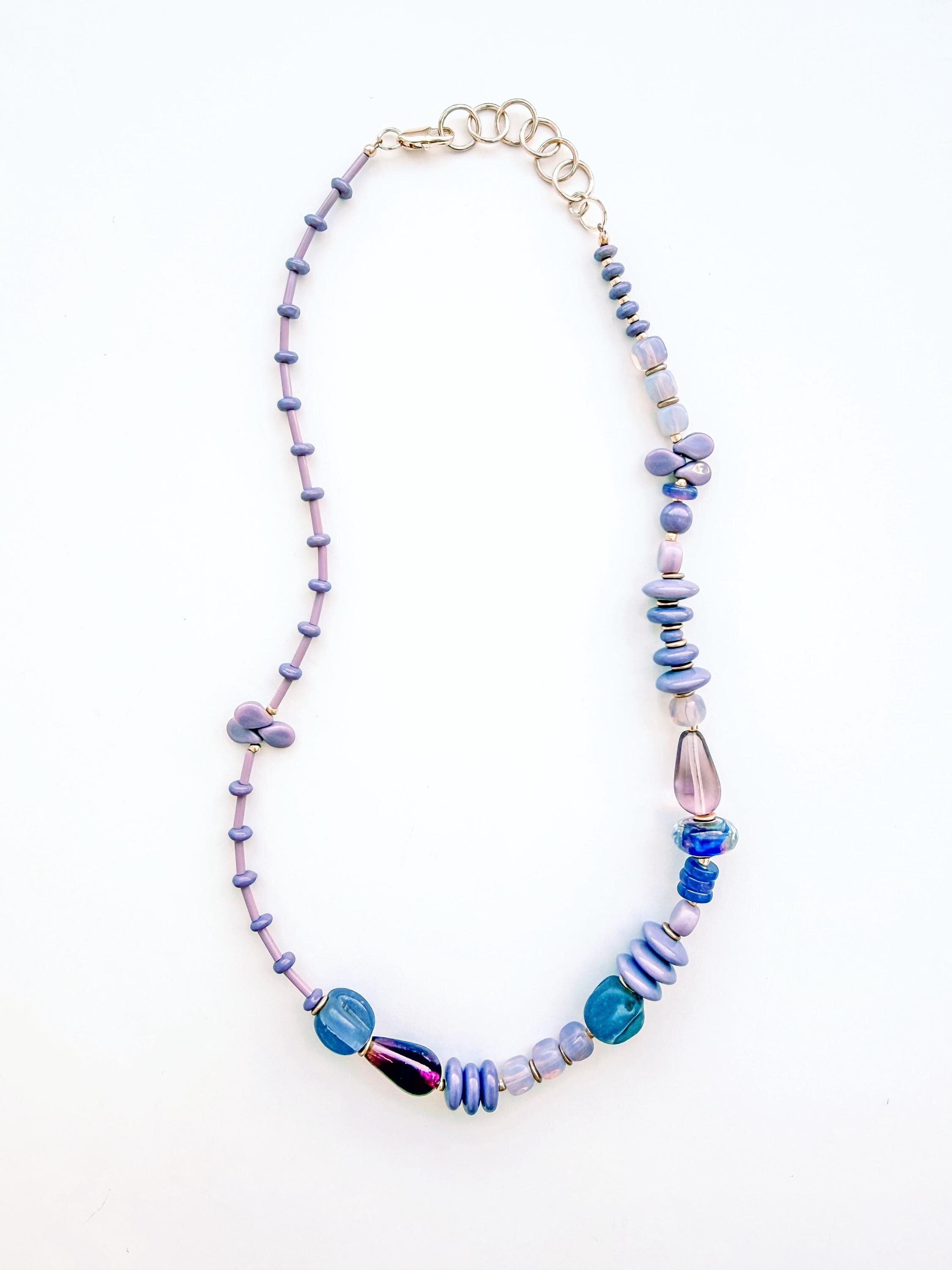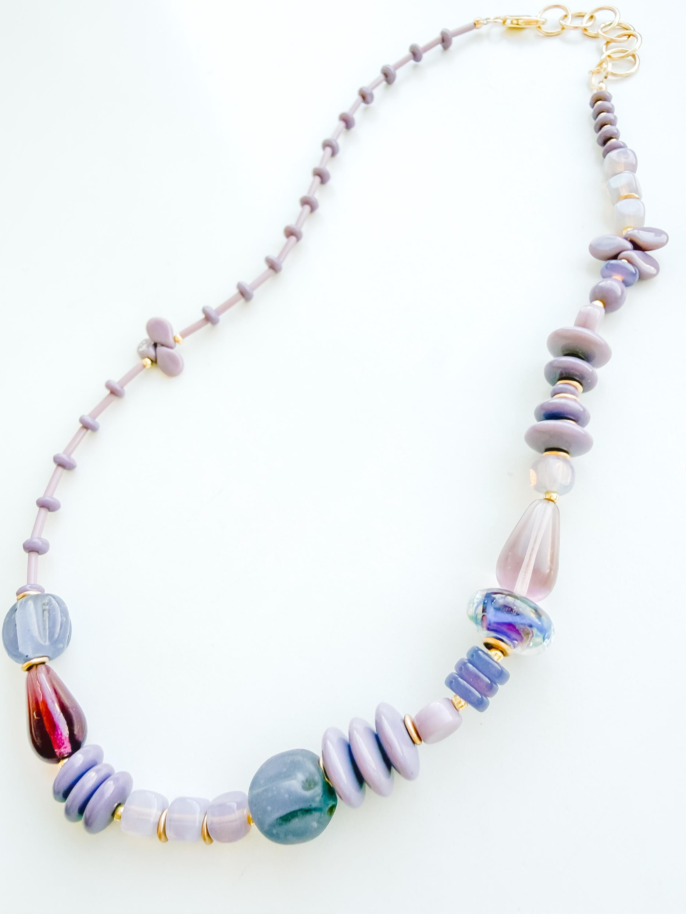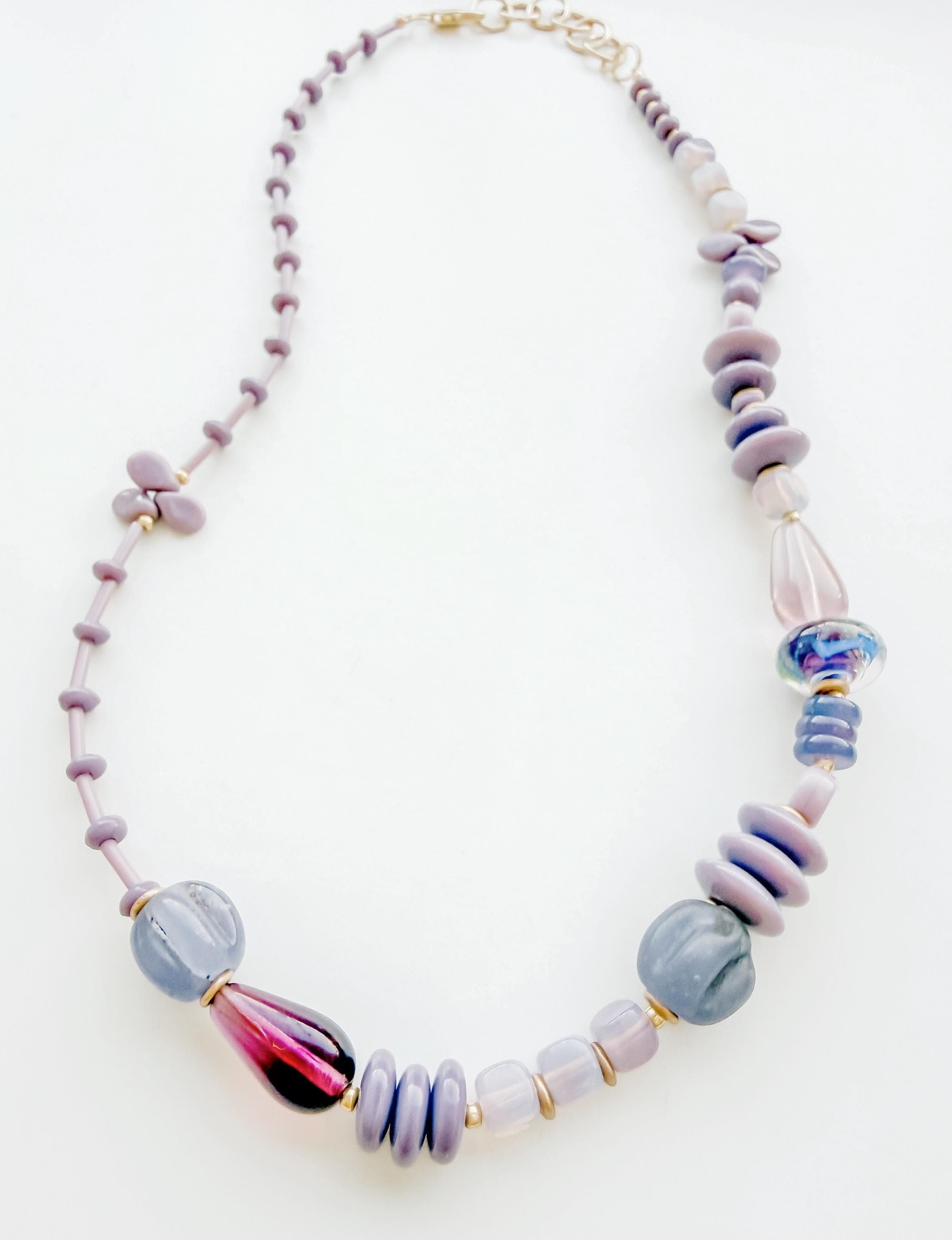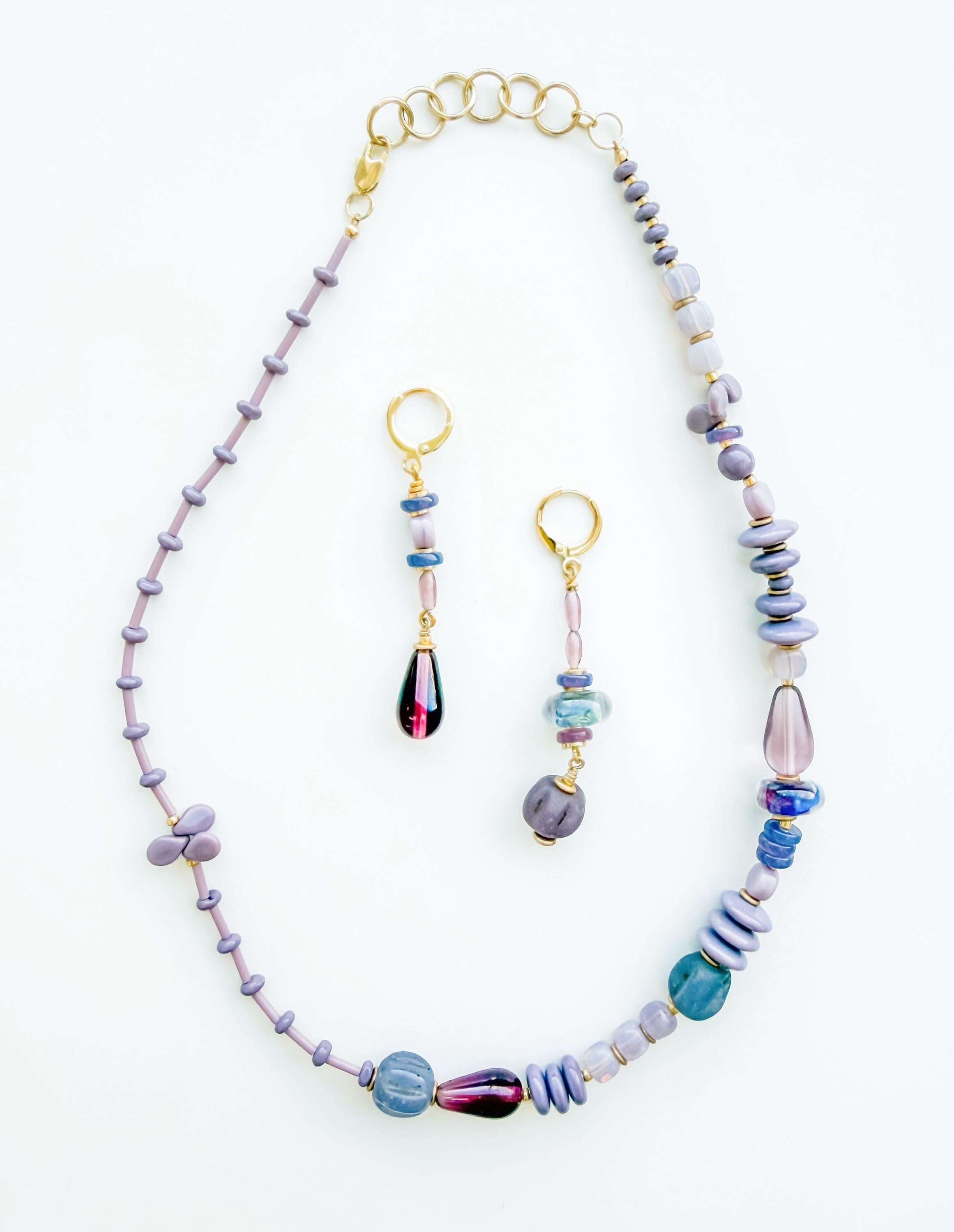 An asymmetrical necklace in lavender, plum and violet vintage glass beads. 14k gold-filled chain & lobster clasp. Adjustable 17.5-20." in length. See my shop for the matching earrings. See my shop for matching earrings shown in last photo. 16-18" adjustable length.