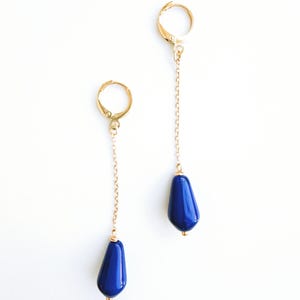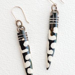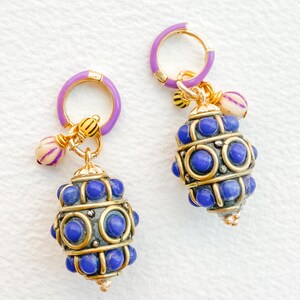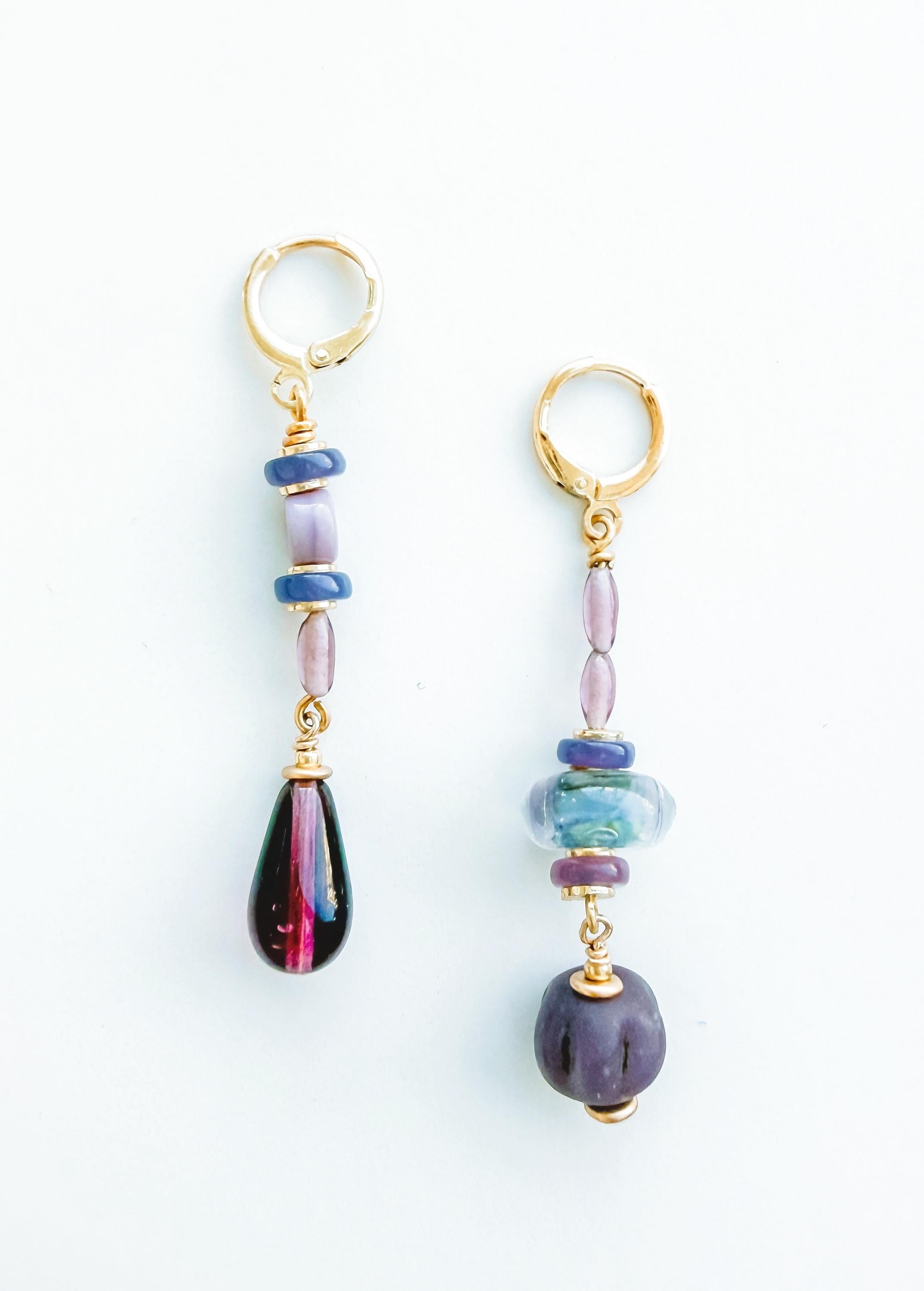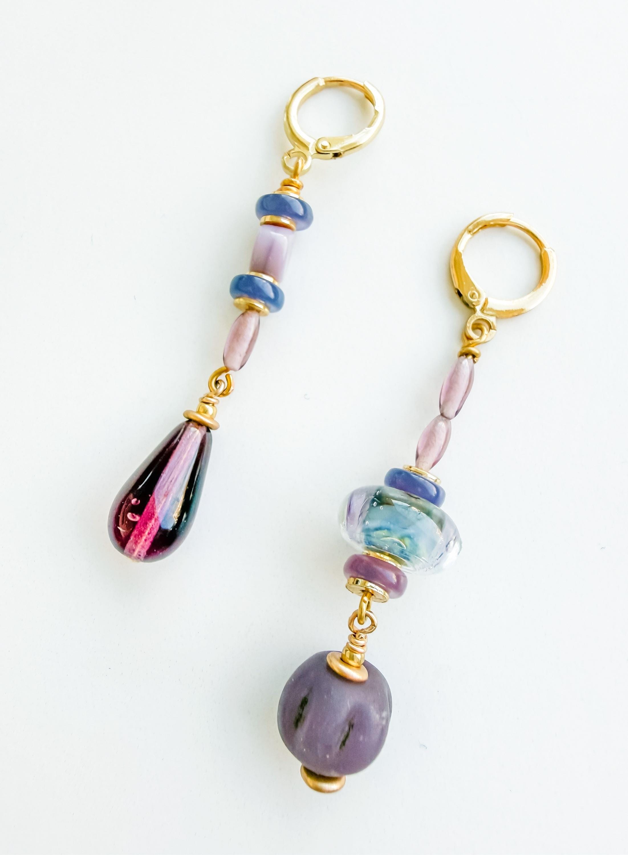 Complimentary but not identical! These earrings feature vintage and handmade glass beads in shades of lilac, lavender and plum. 14k gold-filled everback earring components. 2.25" in length.
