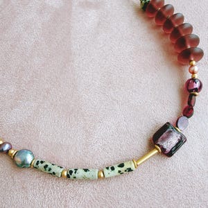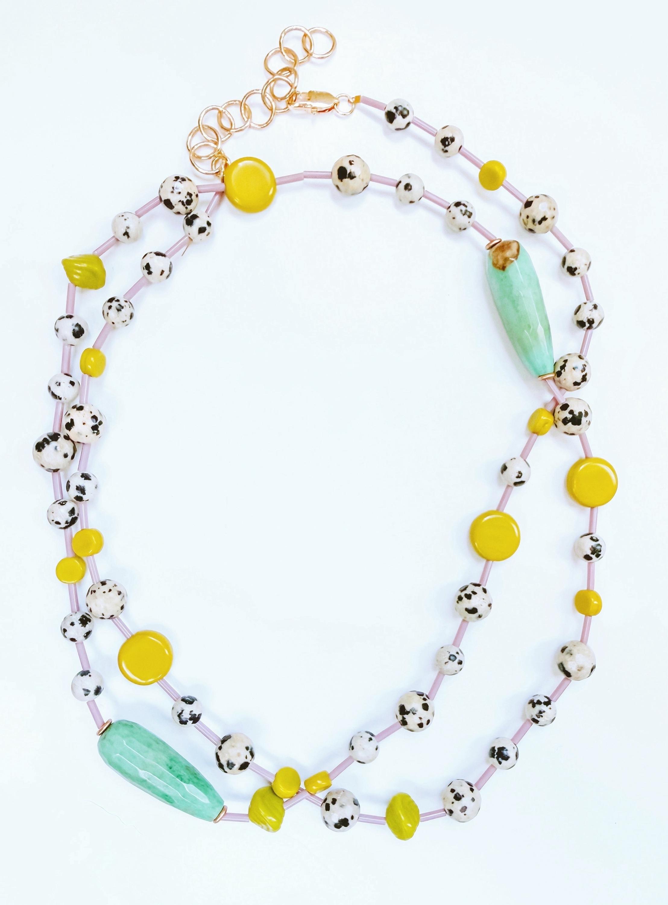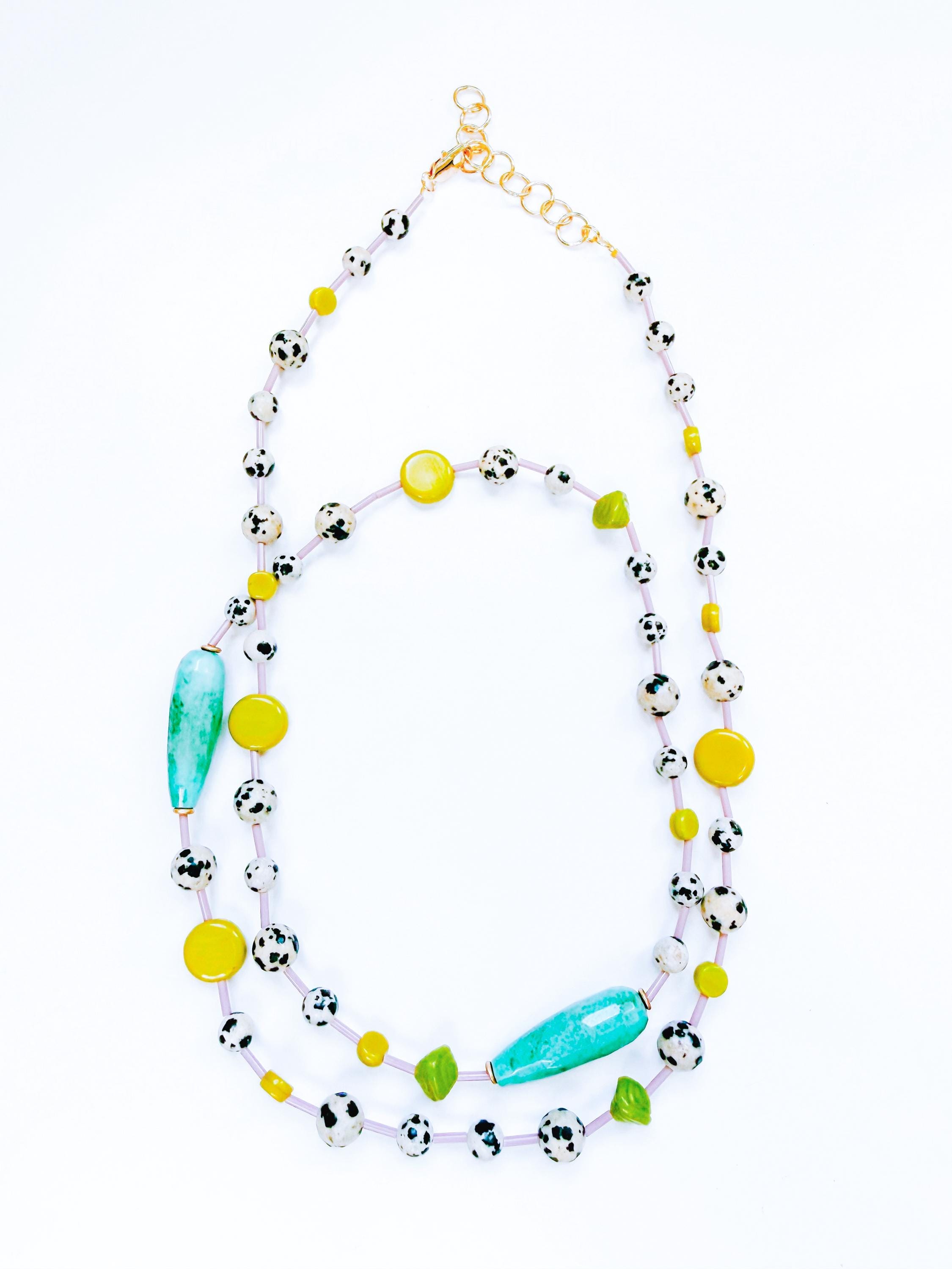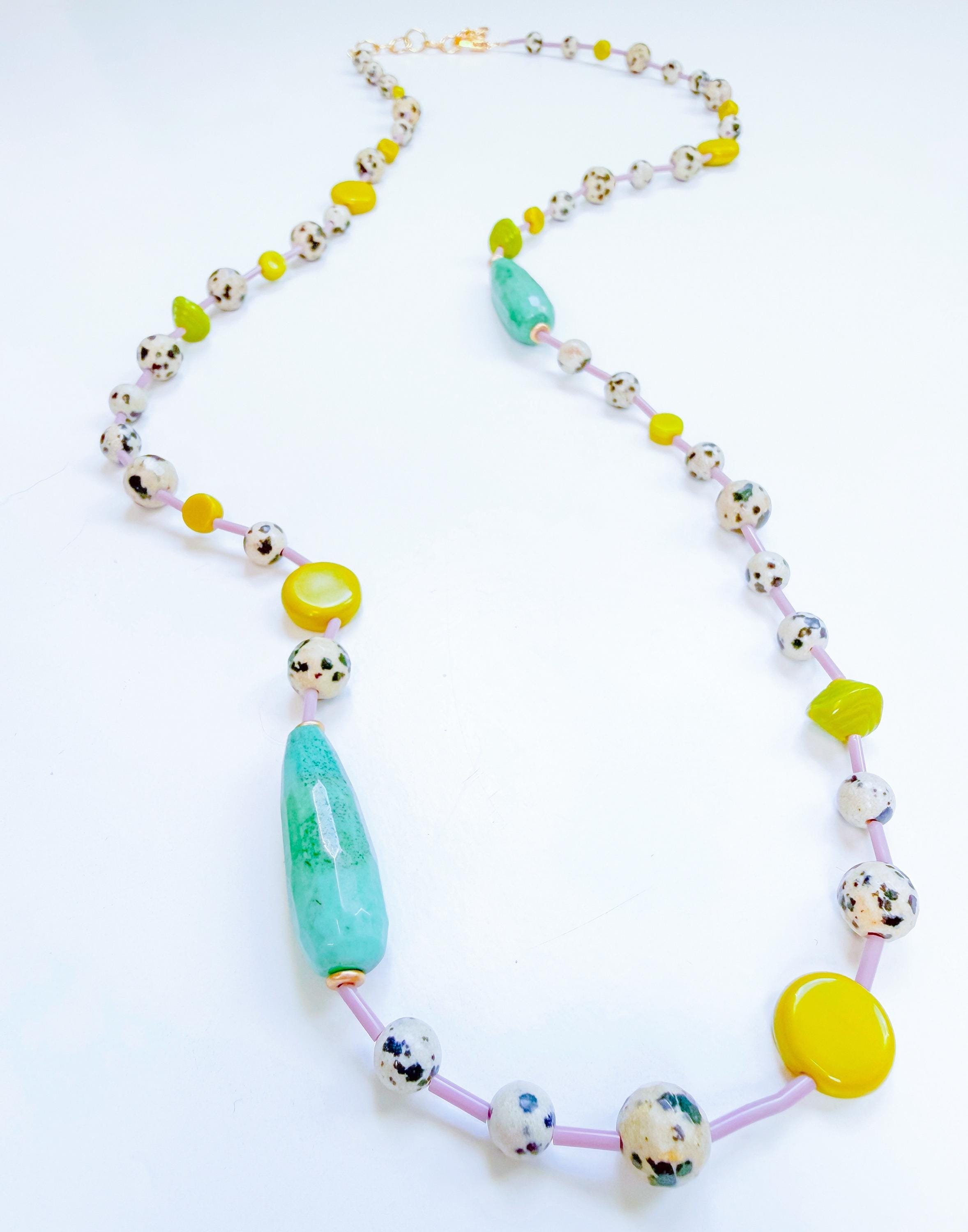 Faceted turquoise, dalmation jasper and chartreuse vintage glass are separated by lavender miyuki tube beads. It can be worn full length or doubled. It measures 36" and has gold-filled lobster clasp & chain.