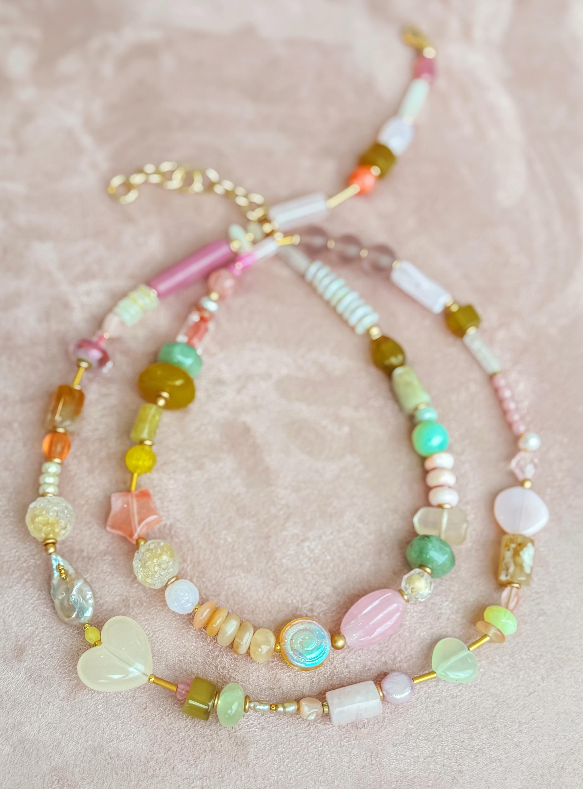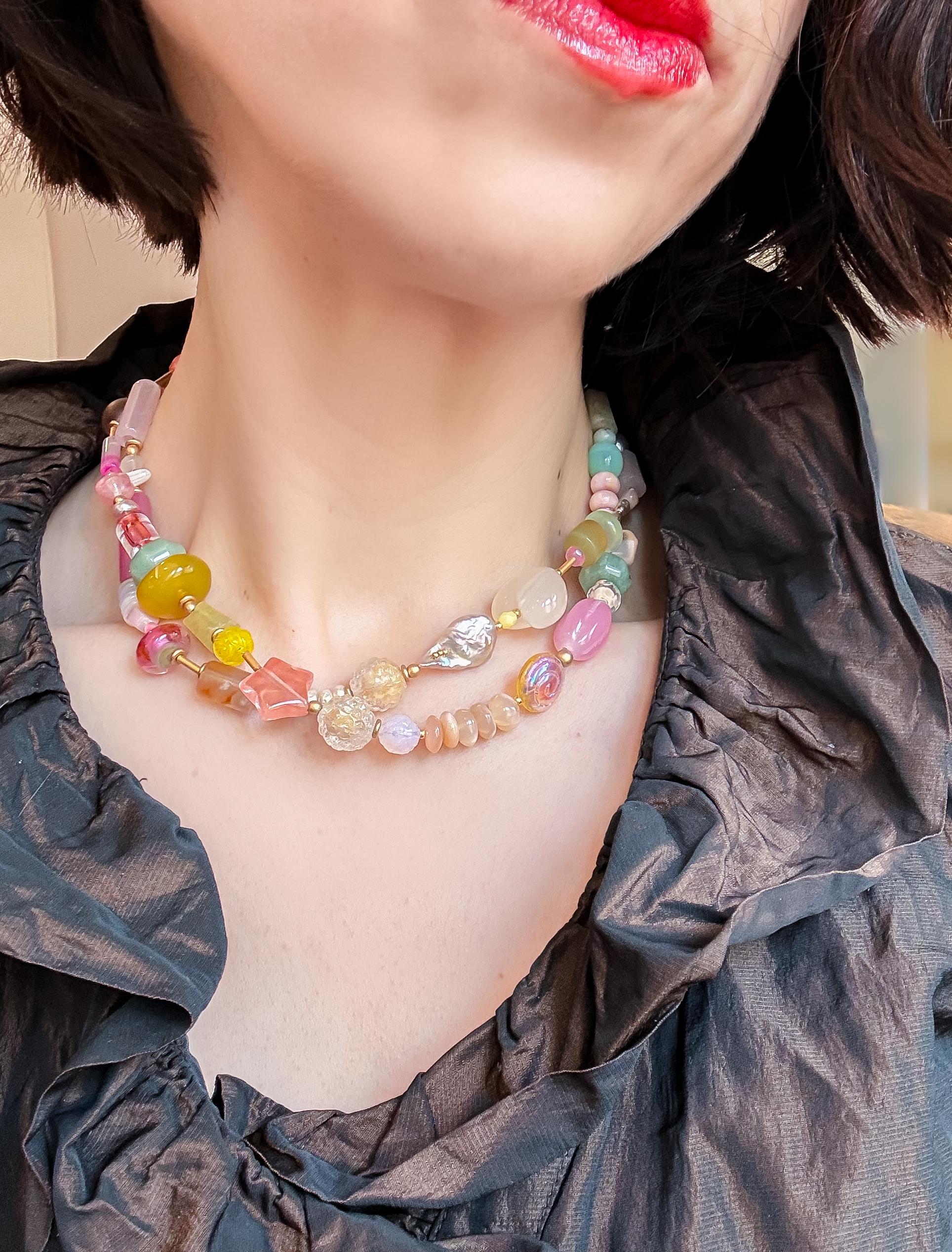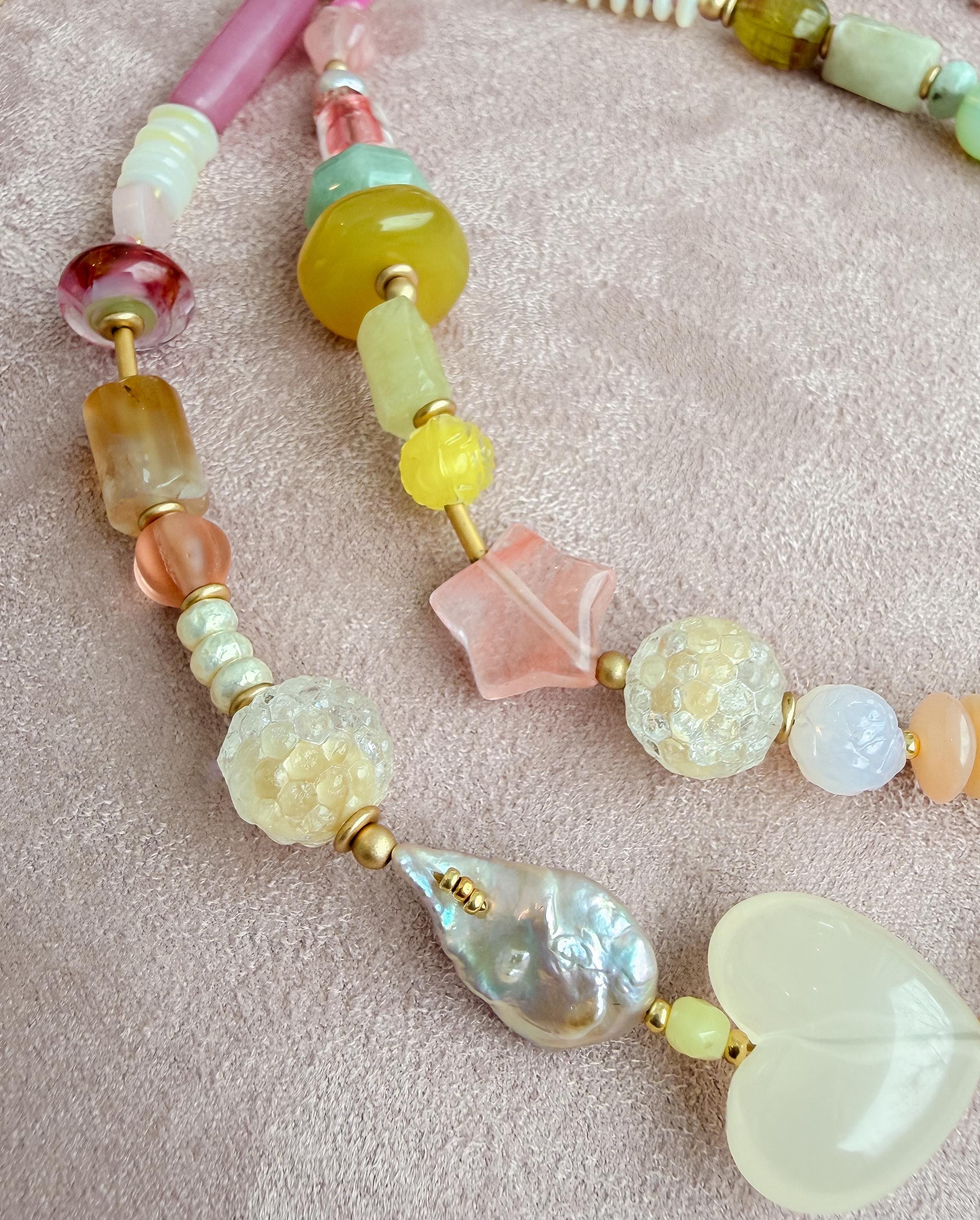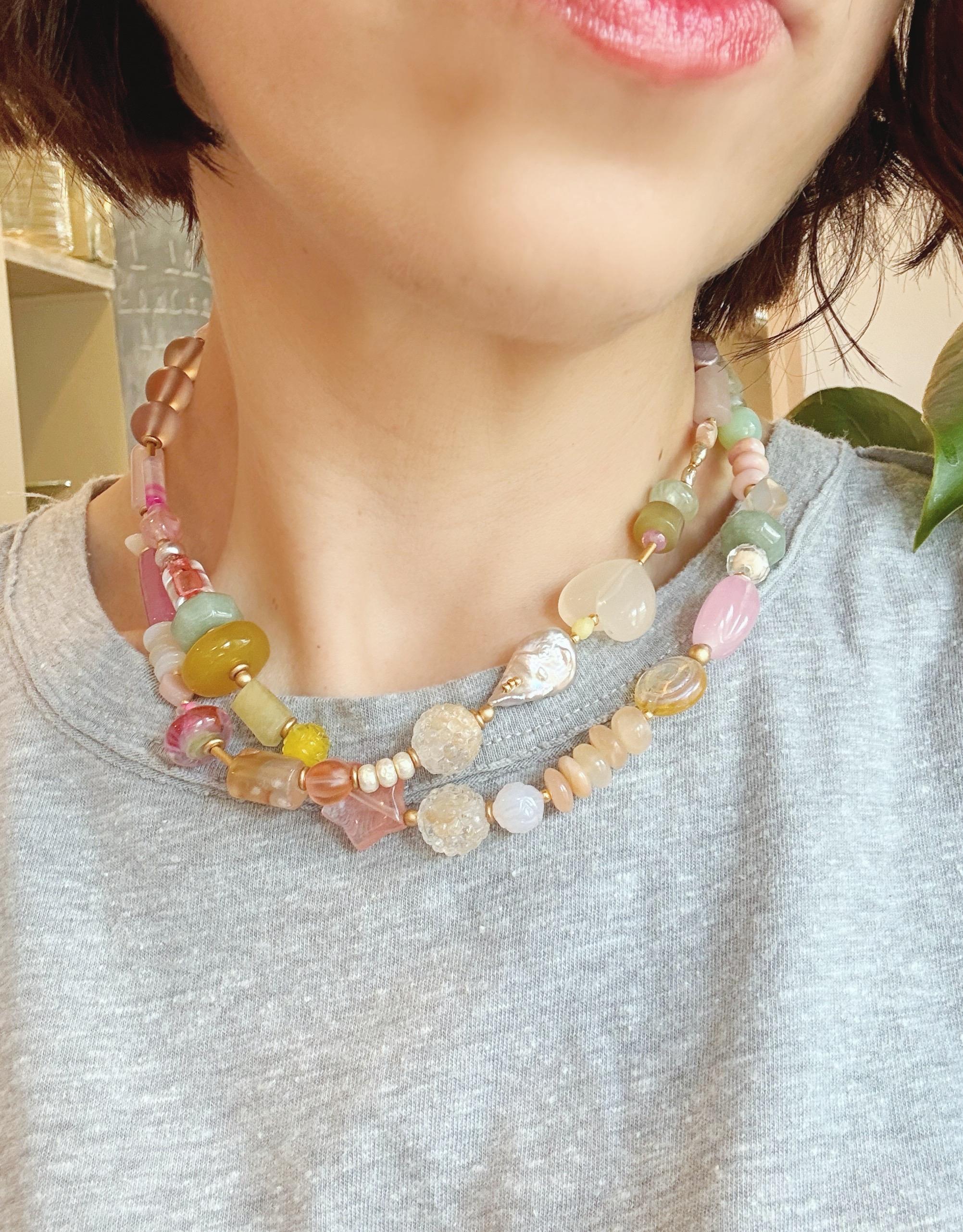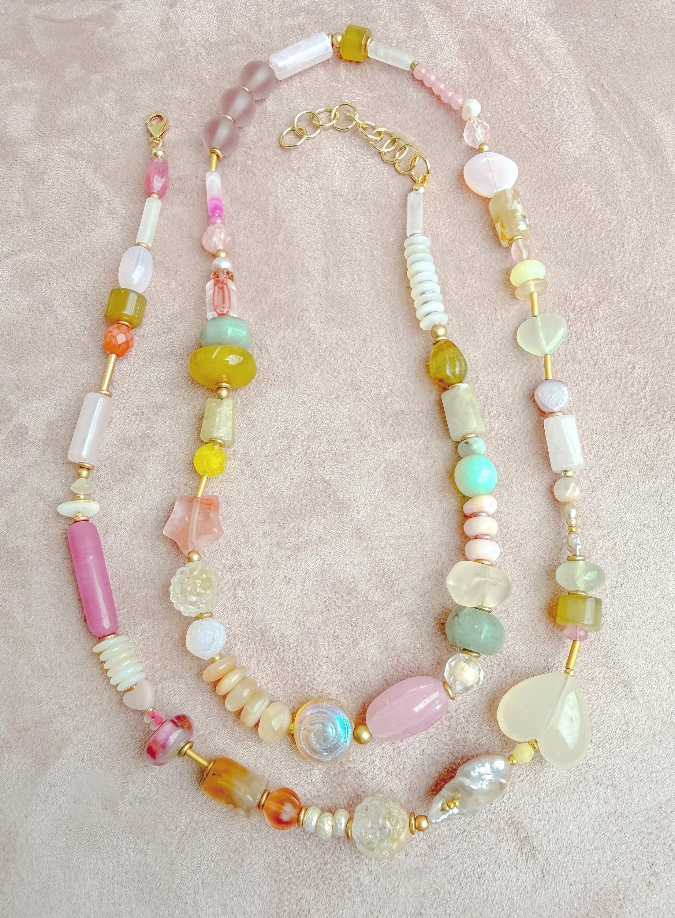 Quiet, soft, warm & luminous. 34-36" of gemstone, glass, resin & pearl. Wear it long or doubled.