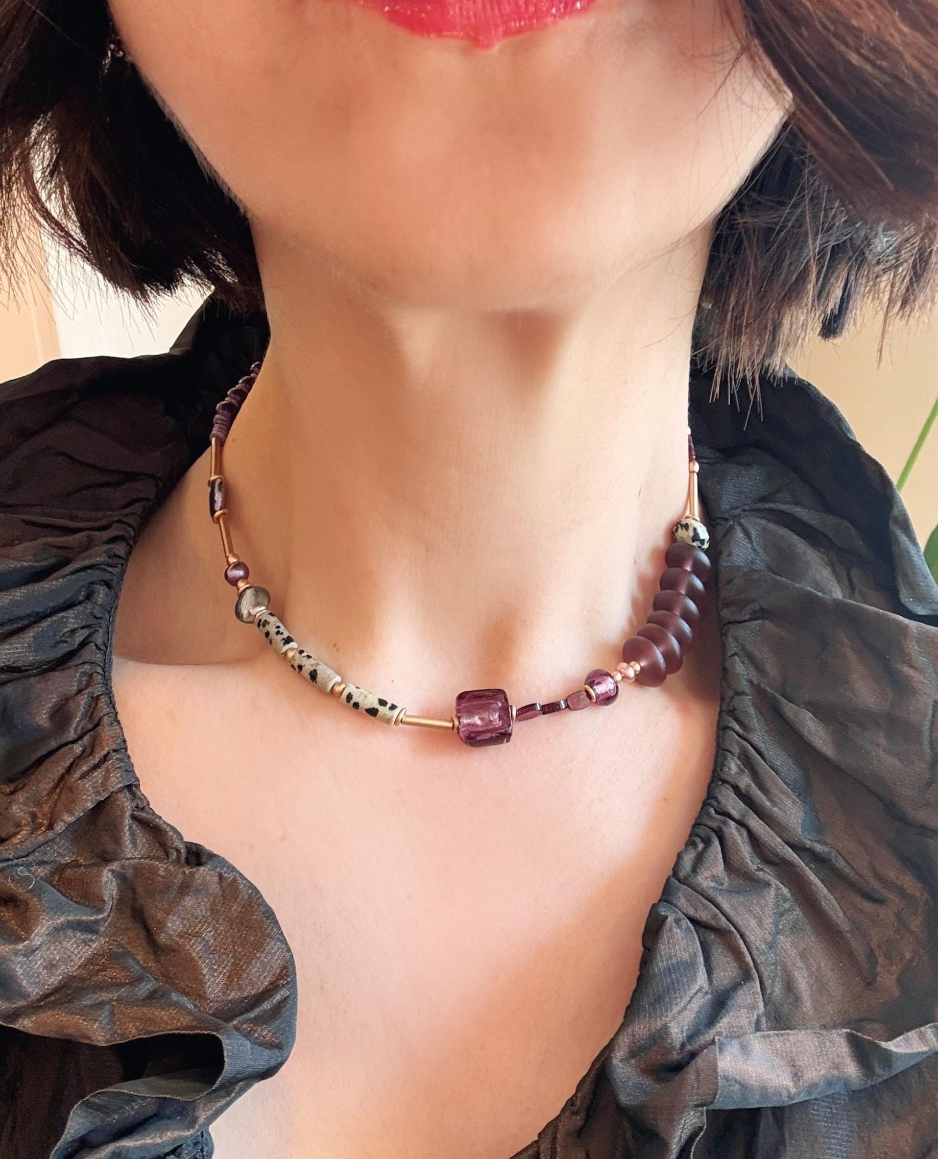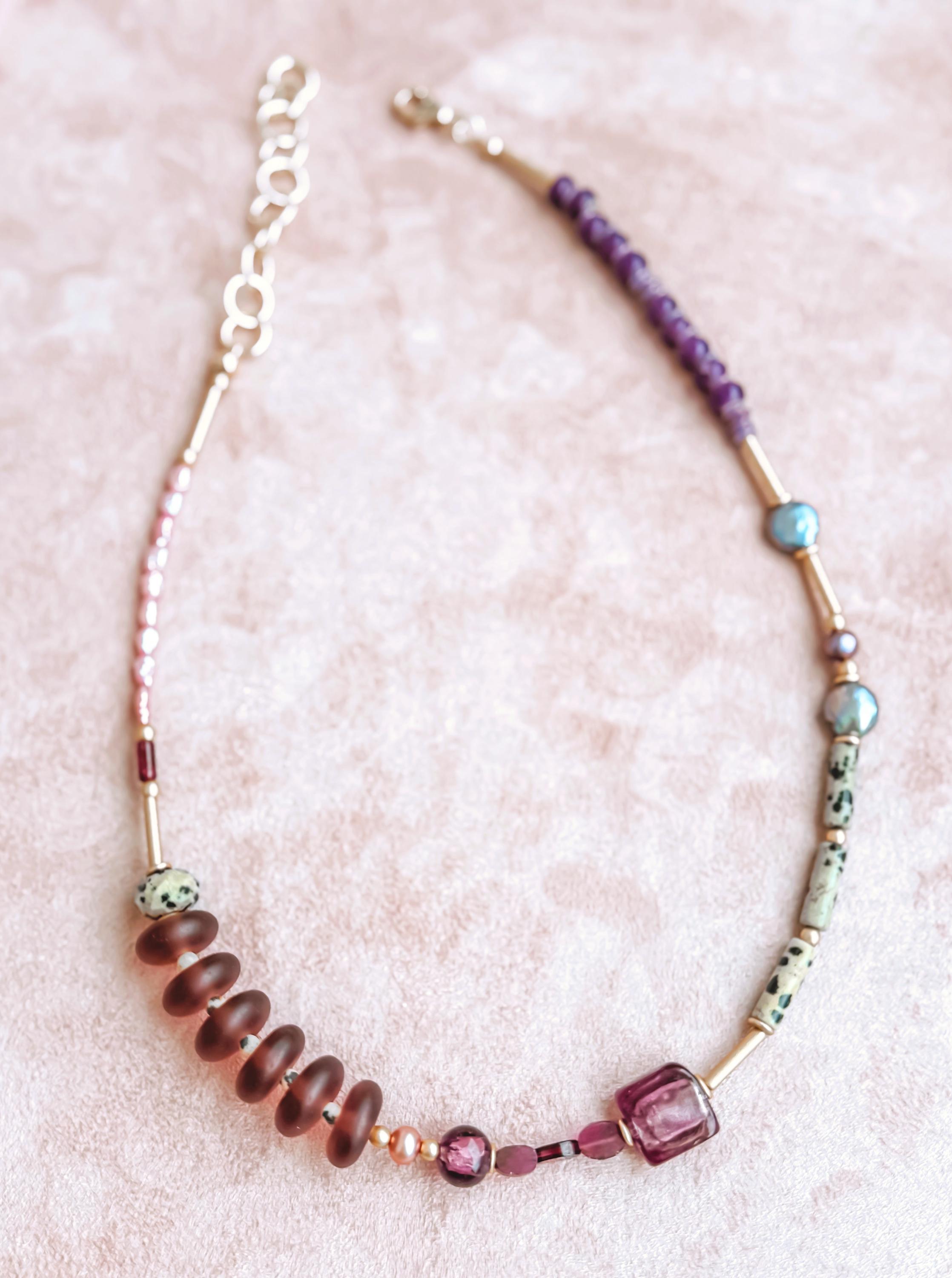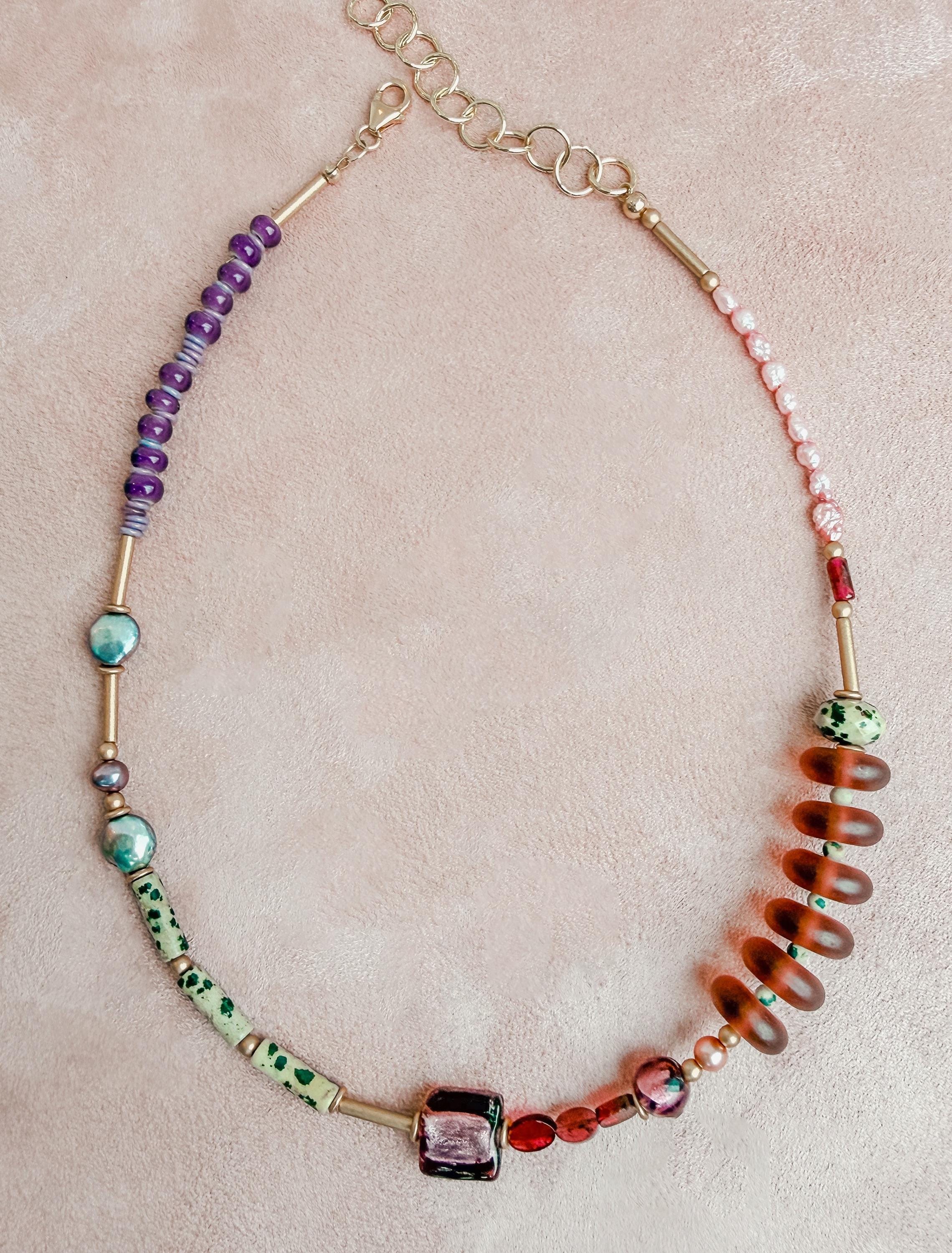 Saturated, confident, tension & depth. 15-17.25" of gemstone, glass, resin & pearl. Wear it long or doubled.