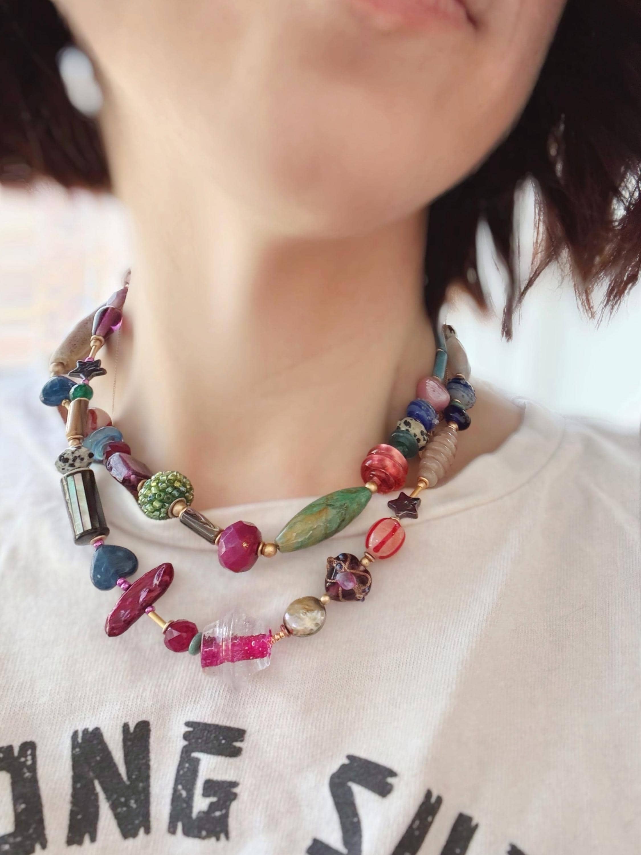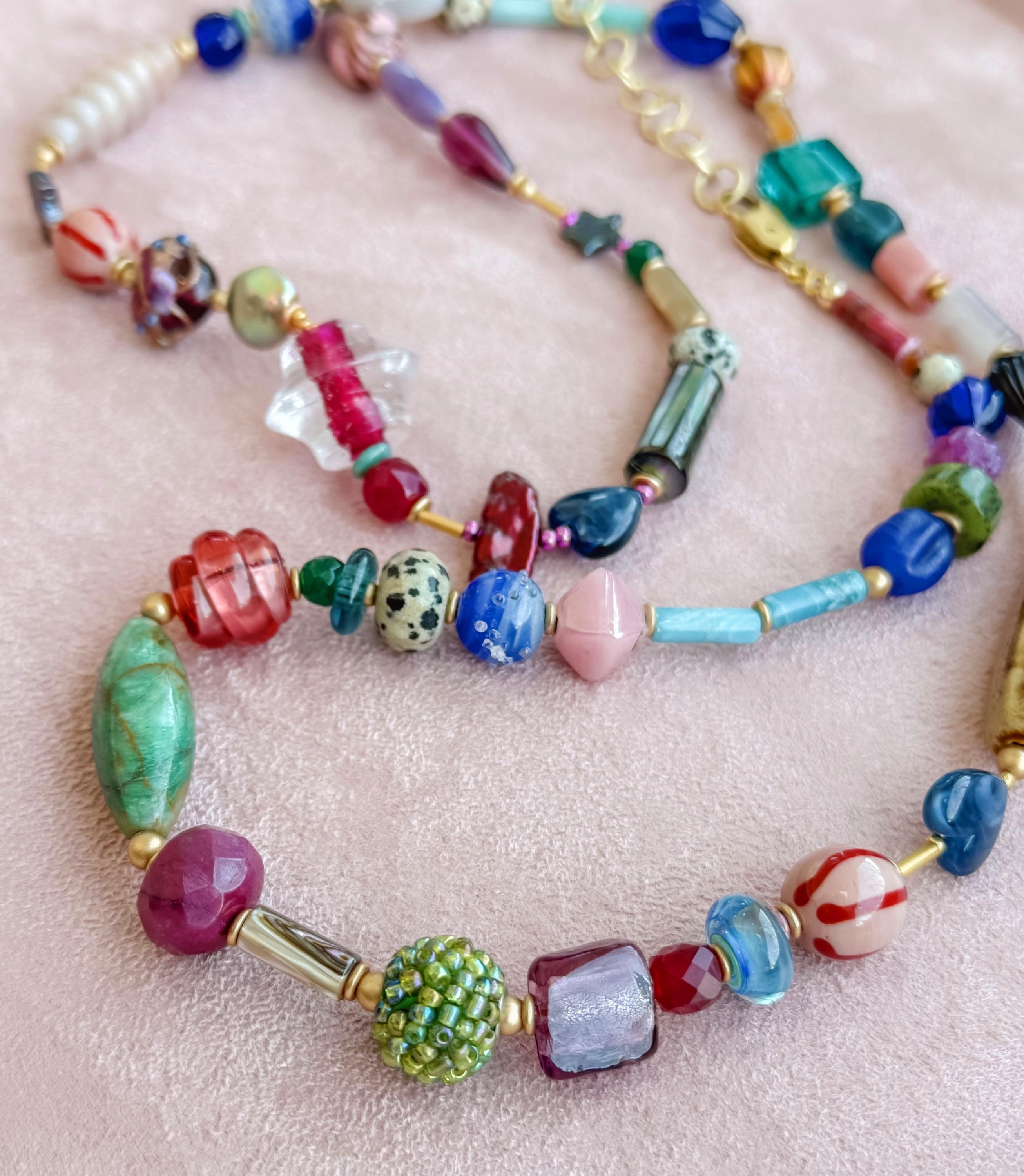 *This piece features: handmade beads, vintage murano glass, freshwater pearl, mother of pearl, agate, chalcedony, aventurine, garnet, apatite, dalmatian jasper, turquoise, and more.