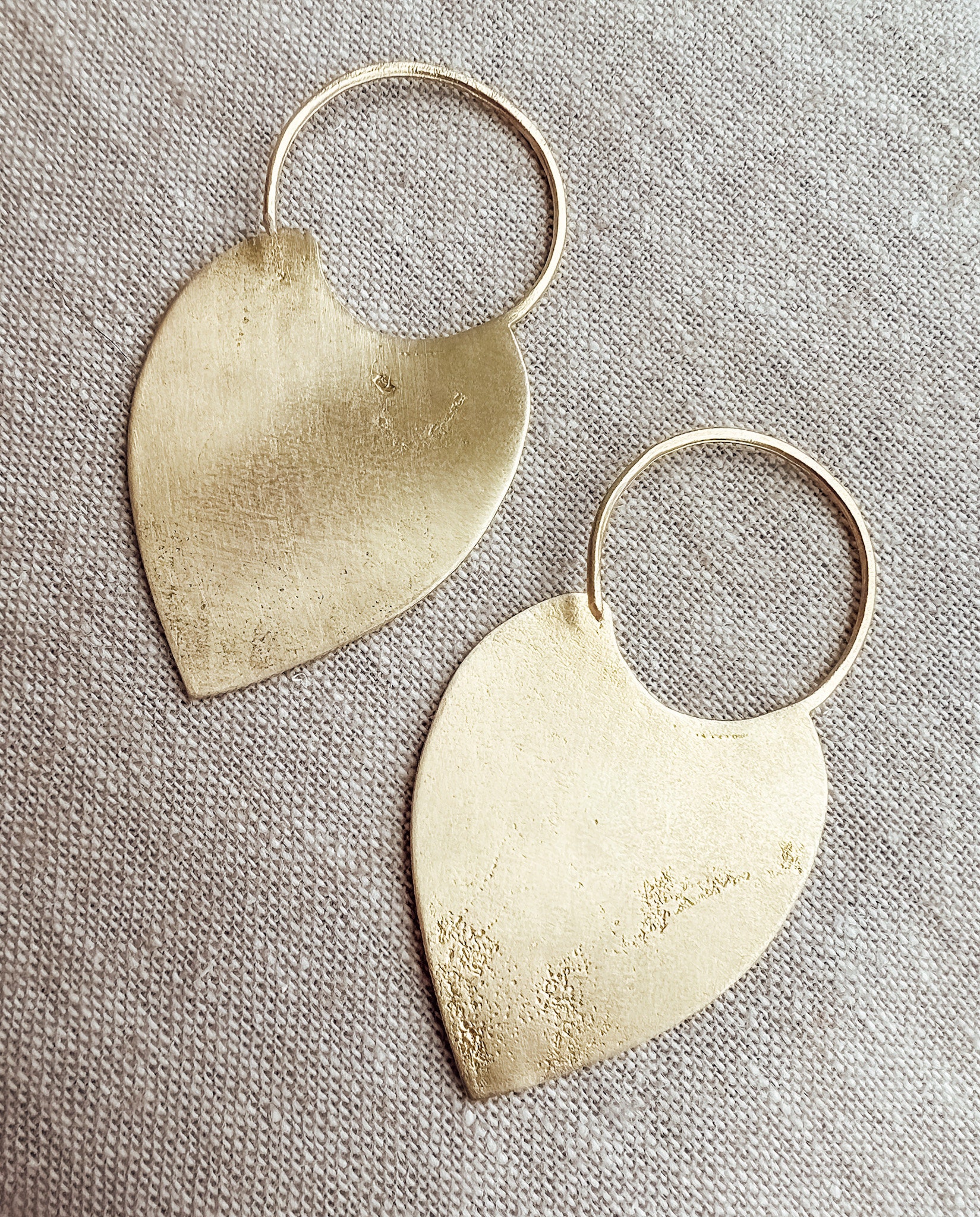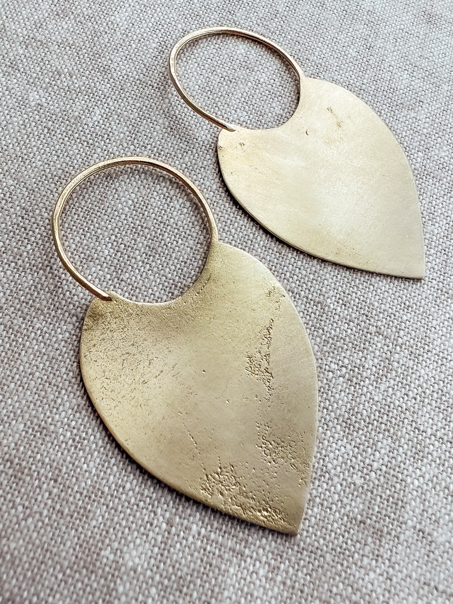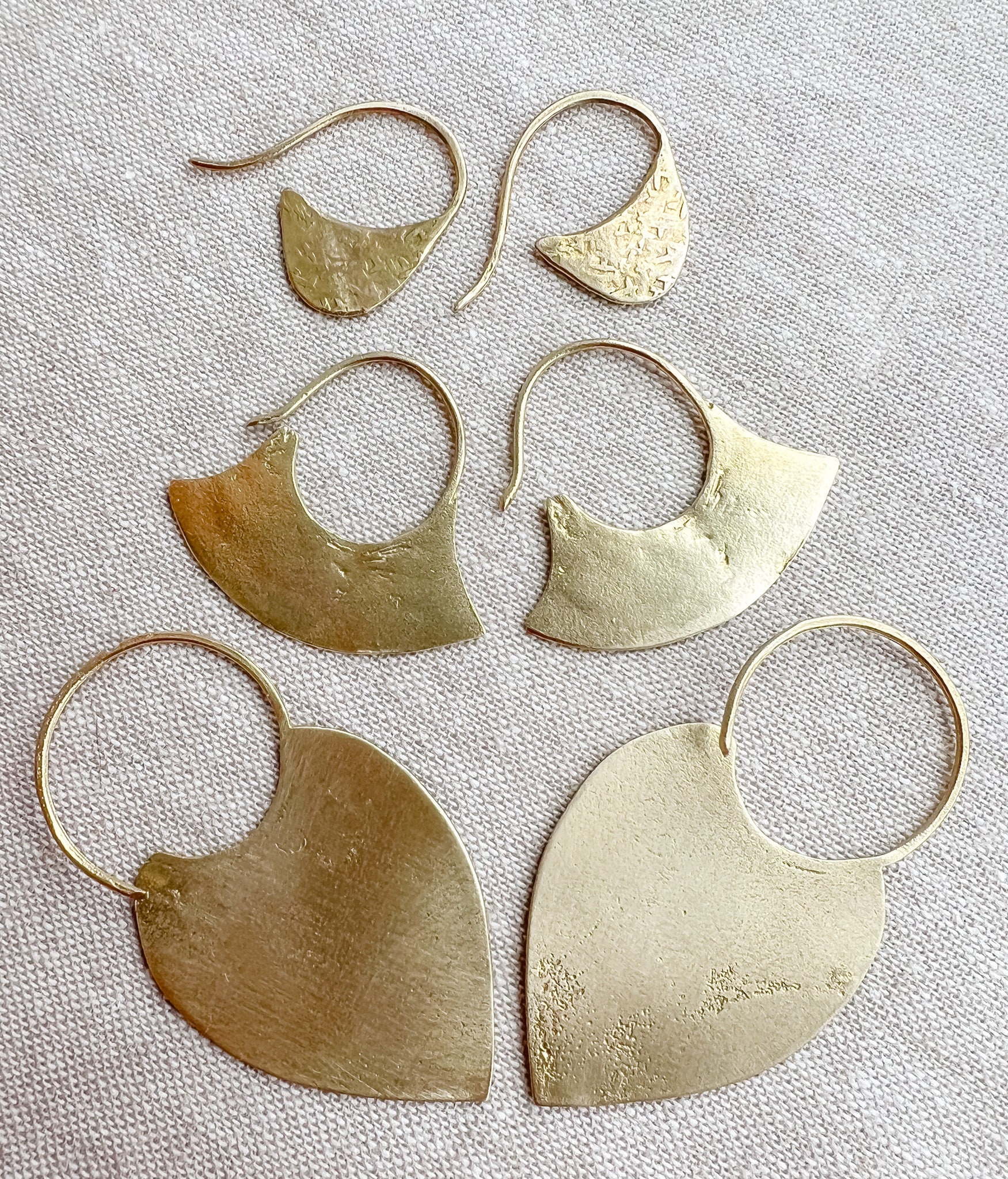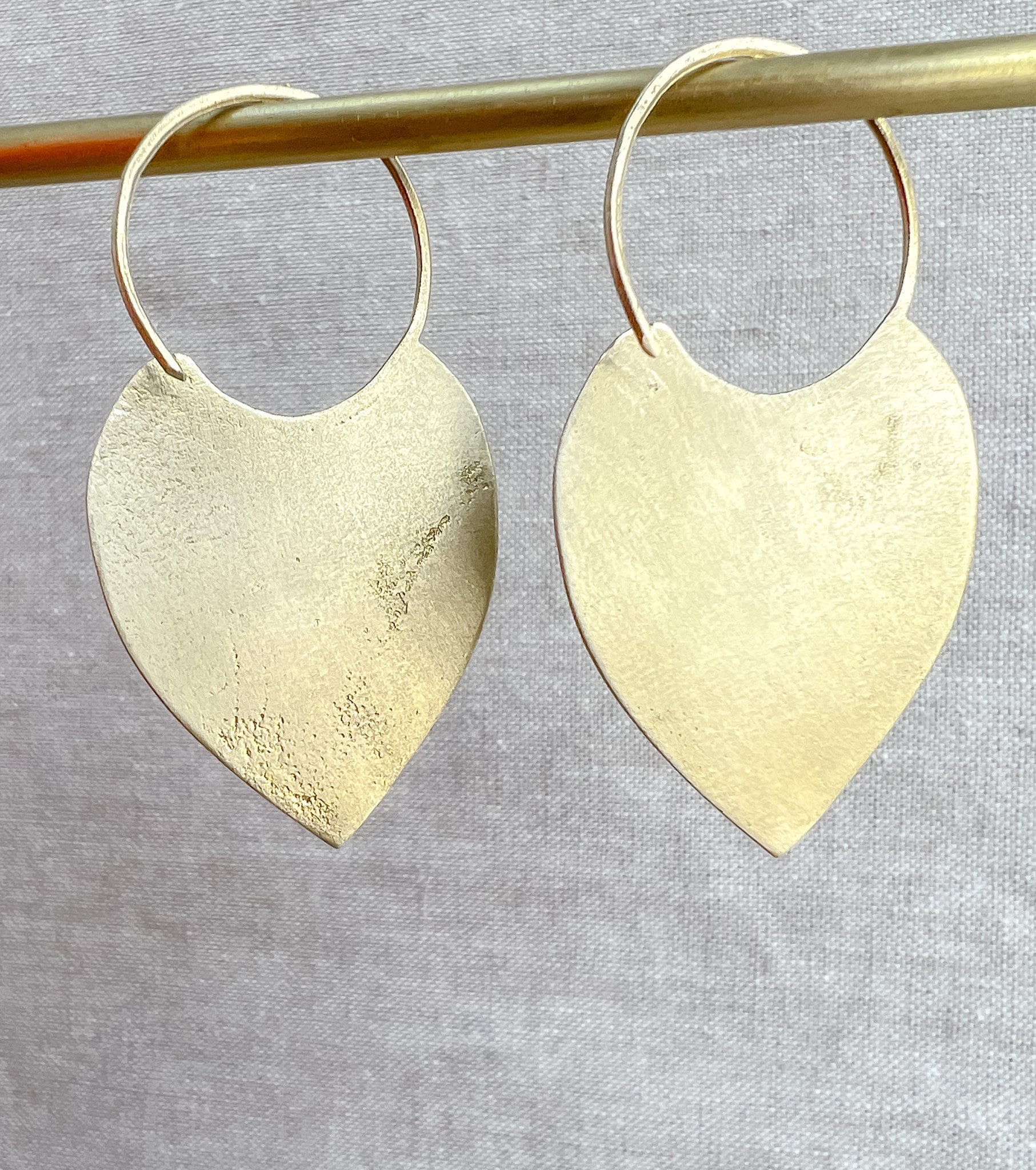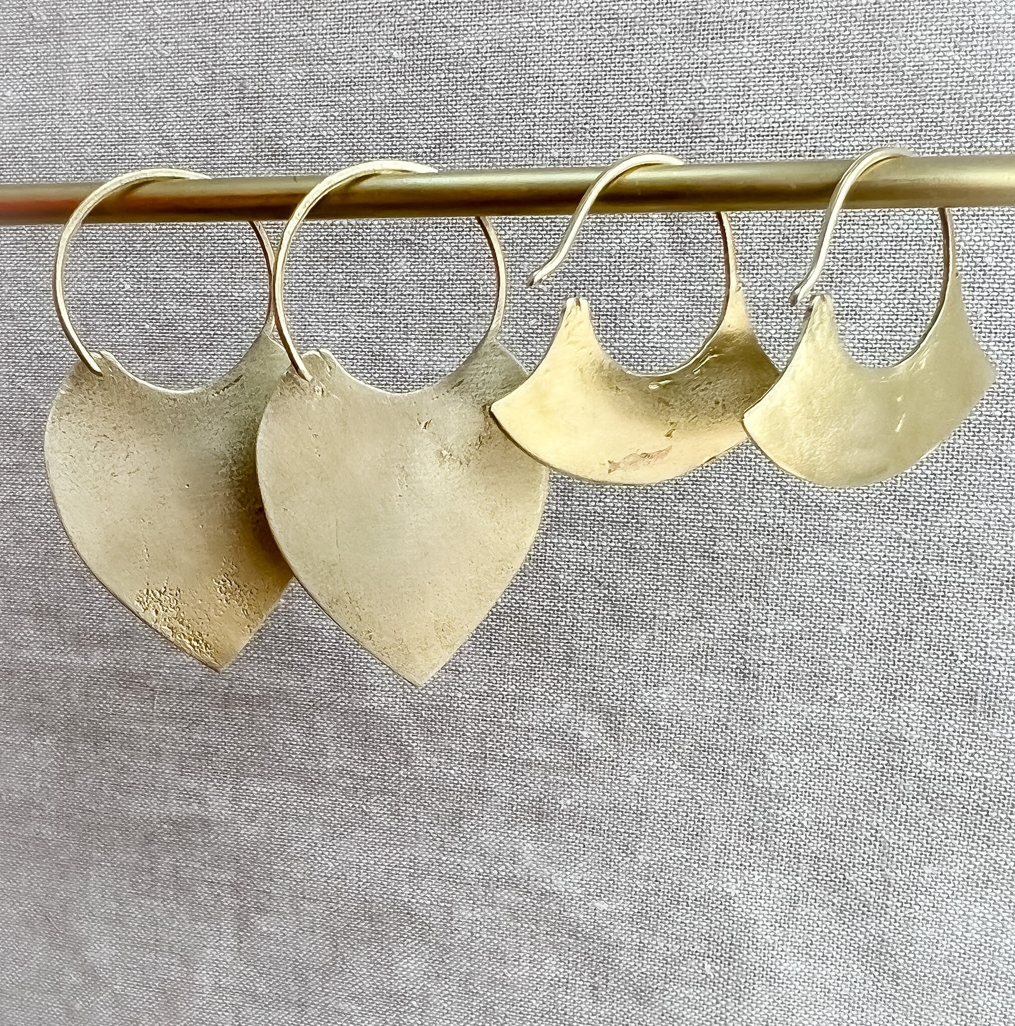 Thick slices of brass have been sawn into petal shaped disks reminiscent of a lotus flower. The curved wire can be gently flexed away from the petal to slide in and out of your ear. After tumbling to a glossy finish I lightly buff them with a wax that seals and protects from tarnish. Each petal hangs about 2".