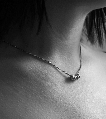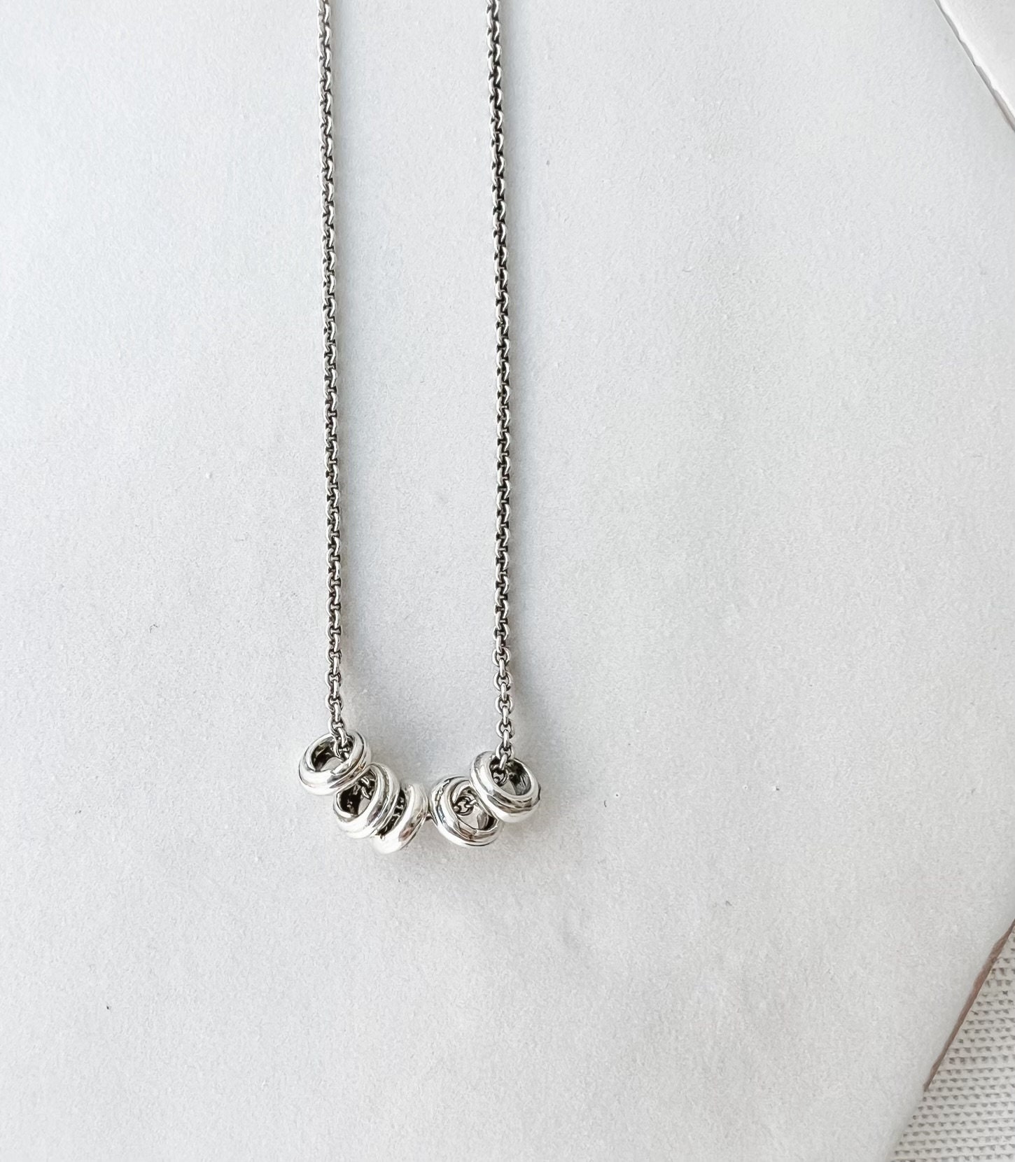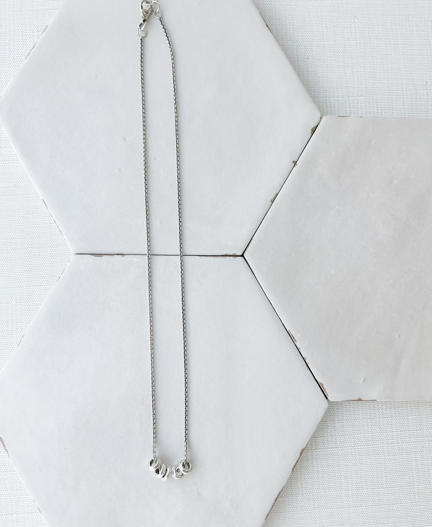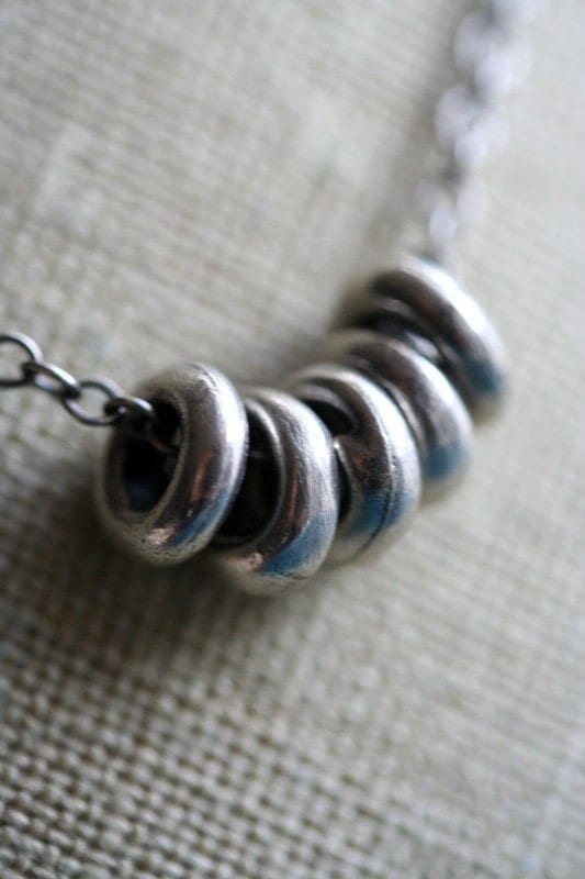 These small, but thick, sterling beads have been cast from rings of glass. I've strung five of them on delicate sterling chain, finished it off with a lobster clasp and brought the entire piece to a glossy finish with a touch of oxidation. Necklace adjusts between 18" - 19" and sits beautifully for an effortless, everyday look.